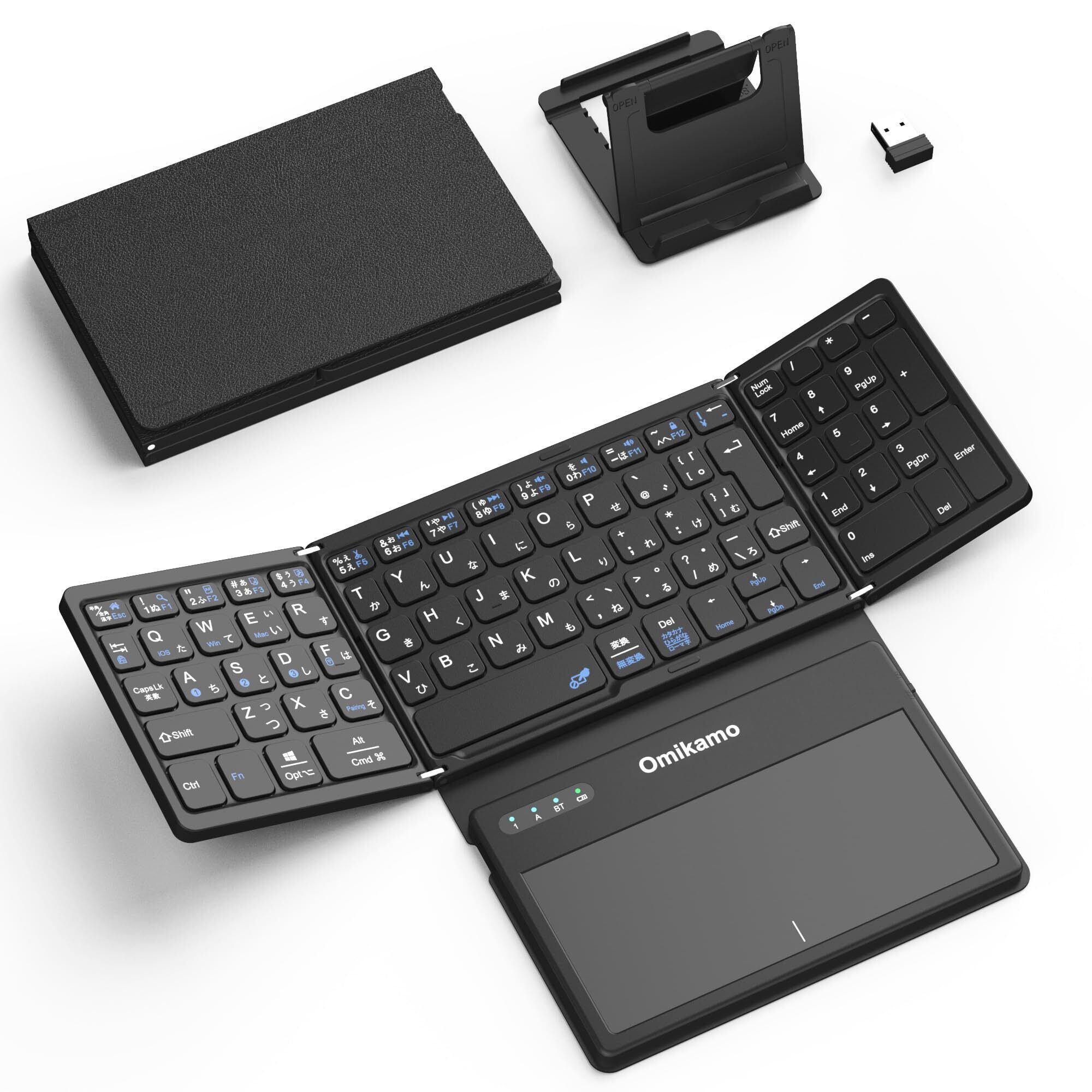 【2022最新】【最新型】Omikamo キーボード bluetoothと2.4GHzUSB無線 折り畳み式 JIS標準日本語配列 大型タッチパッドとテンキー搭載 4台デバイス切替 左右Shiftキー/L型Enterキー搭載 ワイヤレス iPad mini スマホ iOS/Windows/Mac対応 軽量 薄型 パンタグラフ 充電式 (黒)
