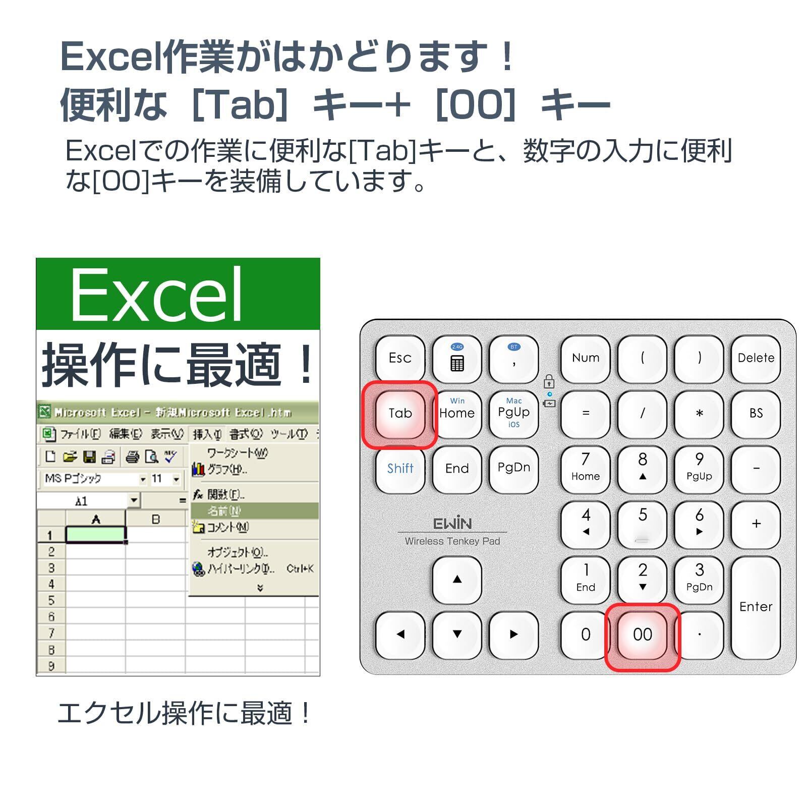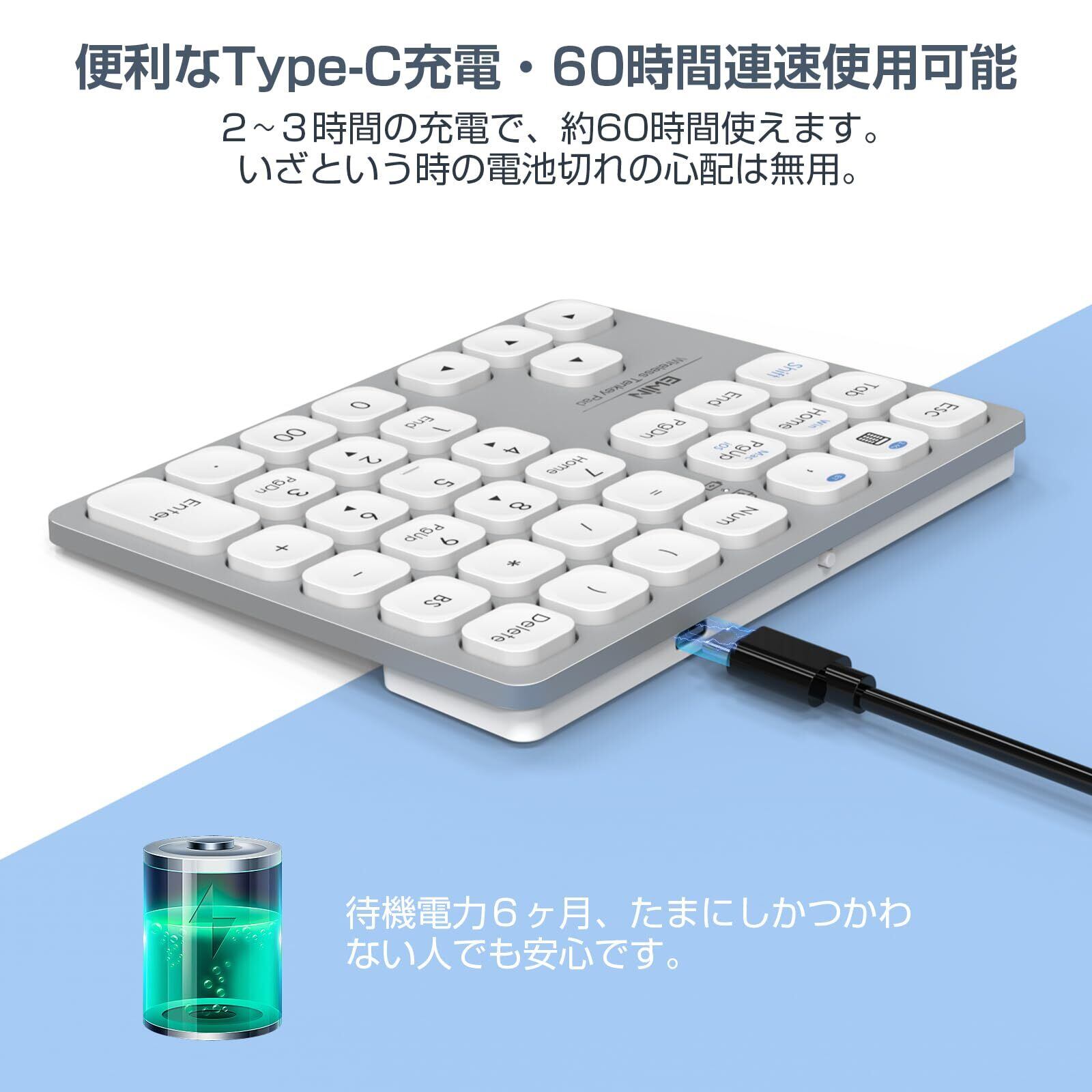 【新春セール】Ewin テンキー Bluetooth/2.4G接続 ワイヤレス 数字キーボード Bluetoothキーボード 2台まで接続 超薄型 numlock連動 Type-C充電 37キー 日本語対応 iOS iPadOS Mac Windows Androidに対応 銀白
