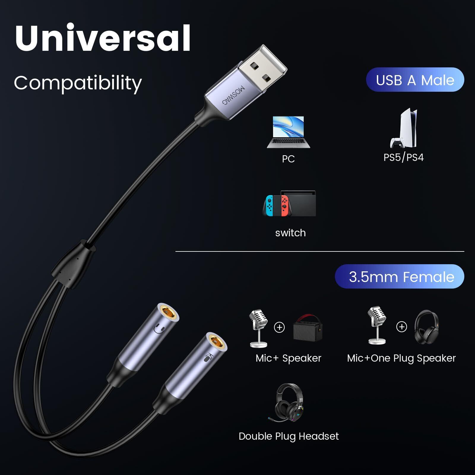 【在庫セール】MOSWAG USBオーディオアダプタ、ステレオUSB外部サウンドカード、3.5 mmイヤホンとマイクTRSジャックから対応Windows、ノートパソコン、デスクトップWindows、MAC、Linux、PC、PS5、PS4