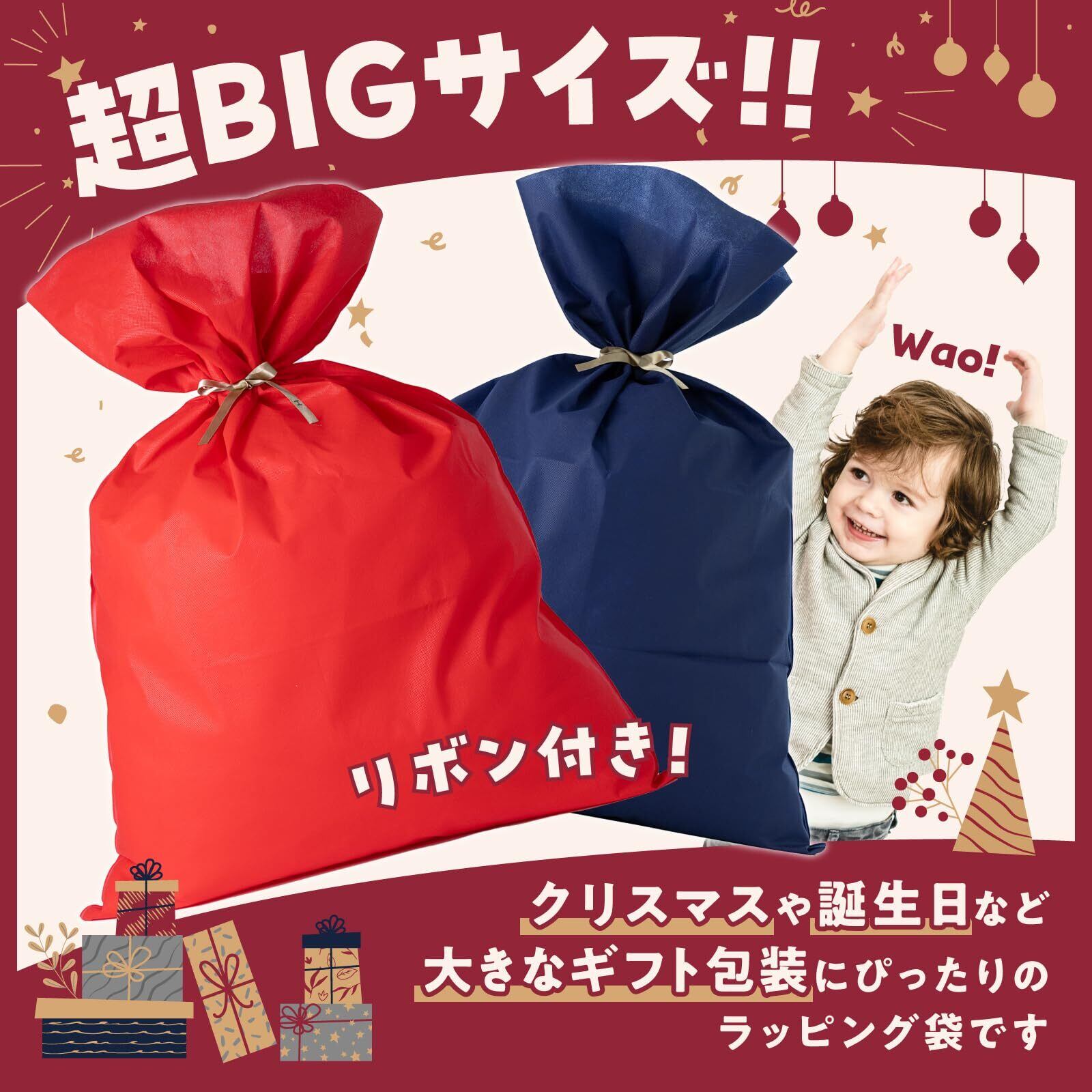 【人気商品】【超特大】ラッピング袋 プレゼント袋 プレゼント用 「 縦1000mm × 横 690mm」 リボン付き 不織布 ギフト 大きい クリスマス 誕生日 (レッド, リボン付属(結ぶタイプ)1枚) | KURASHILABO