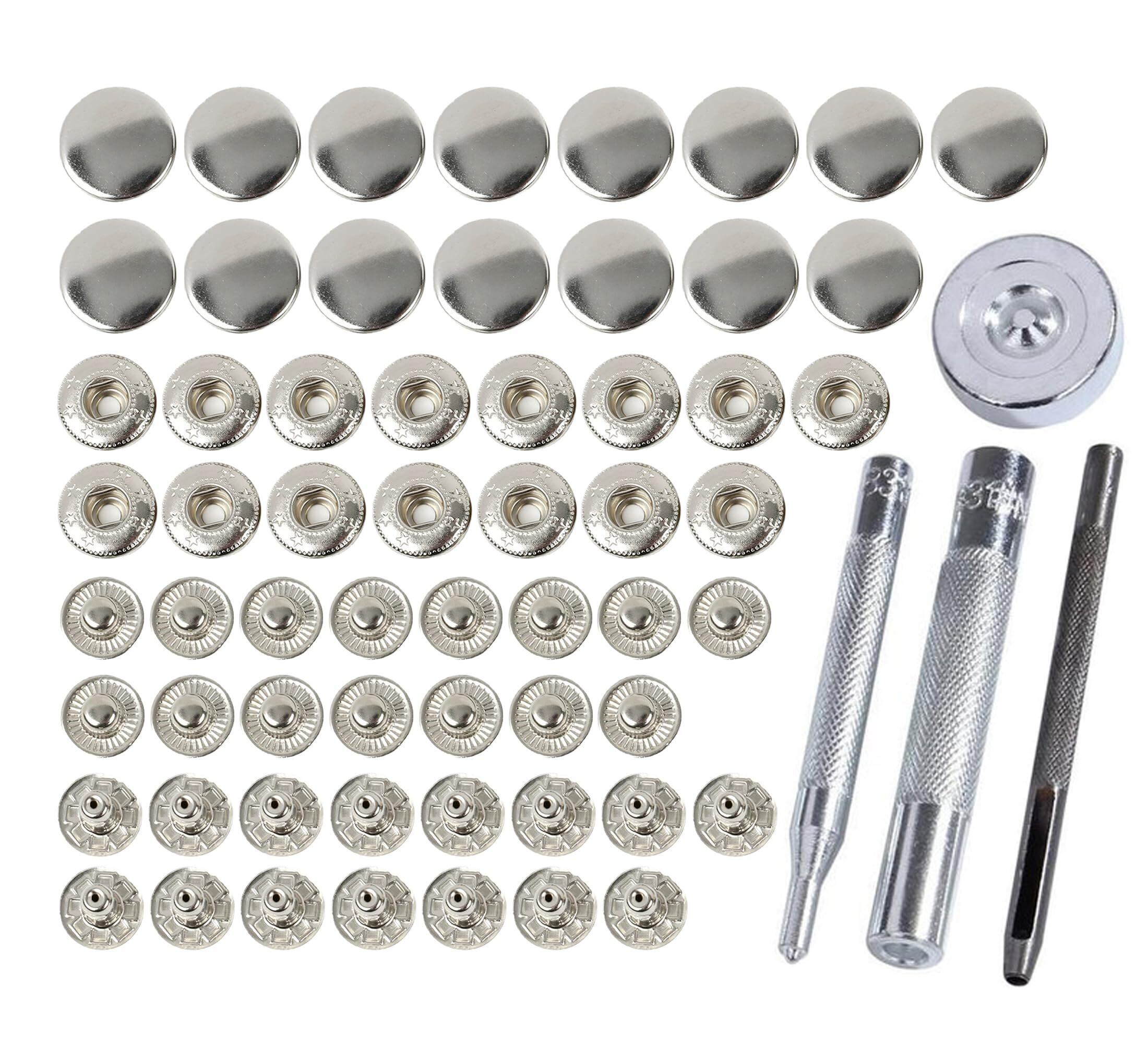 【人気商品】ミライヤ レザークラフト バネ ホック打ち具セット 15mm 15組セット スナップ ボタン 穴あけポンチ 打ち具 打ち台 ハトメ抜き 手芸 ハンドメイド 革DIY シルバー(合計15組+4点打ち具) | KURASHILABO