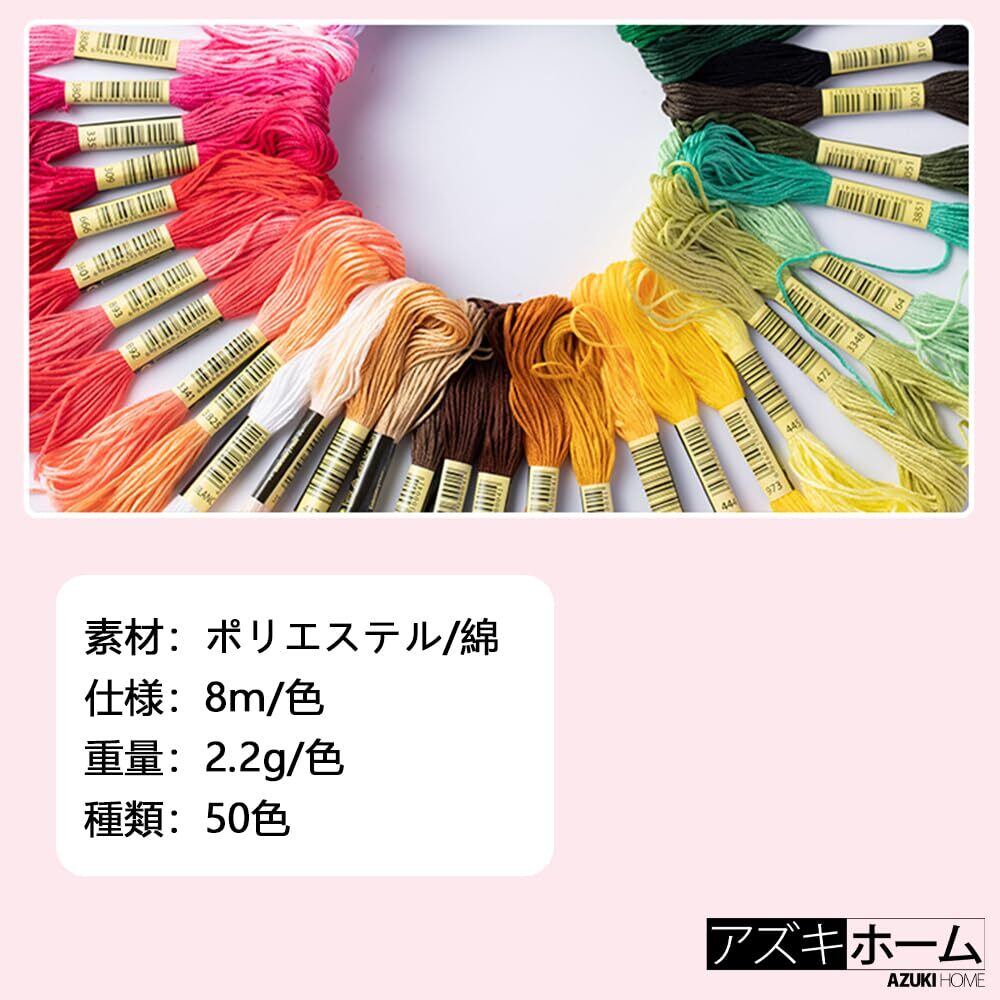 【在庫セール】アズキホーム 刺繍糸 初心者向け カラフル 縫い糸 手芸用糸 刺しゅう糸 クロスステッチ 8m 専用ハサミ付き (50色セット)