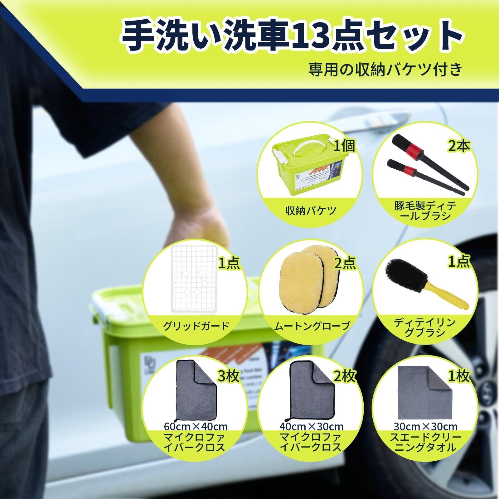 【在庫セール】DU Life 洗車セット 13点 バケツ付き 洗車用品 持ち運びに便利な収納ケース付き 収納&バケツ 2役 拭き上げ用 マイクロファイバークロス 6枚 窓ガラス用クロス 1枚 ホイールブラシ 1本 洗車ブラシ 豚毛 2本 洗車用ムートングローブ 2枚 グリッドガード 1点 (13点セット)