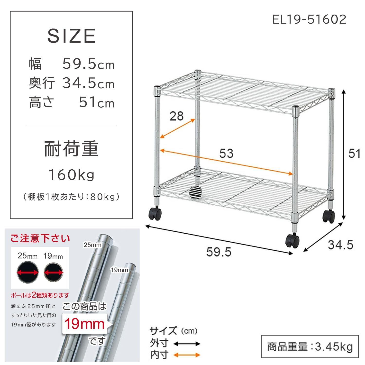 【数量限定】ドウシシャ メタルルミナスラック キャスター付き スチールラック幅60 2段 EL19-51602 軽量で組立簡単工具いらず 幅59.5×奥行き34.5×高さ51.0cm 棚板耐荷重80kg 全体耐荷重160kg 頑丈 防錆加工 ポール径19mmパーツ対応 キッチンラック 隙間収納 テレビ台