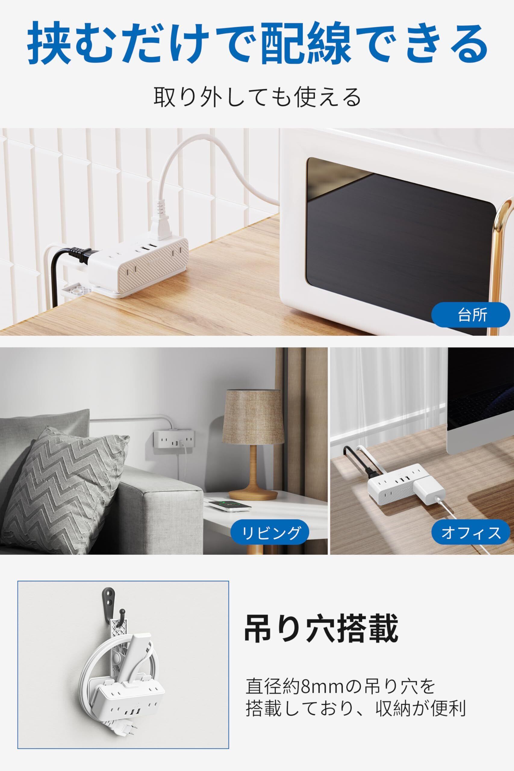 「多様な設置方法」クリップが電源タップ本体から取り外しできます。クリップを使用しない場合でも、背面のフック穴を利用して壁に掛けたり、デスクの上に置いたりすることができます。独自の滑り止めマットが付いているため、デスク上での安定性も抜群です。延長コードを搭載して、使える場所が増えます。延長コードの一部は製品本体内部に取り付けられるため、表示の製品線長には本体の長さが含まれております。180度回転スイングプラグで隙間などの場所でプラグを挿すことができます。使用にない時にもクリップの吊り穴で壁のフックなどに掛けて収納できます。