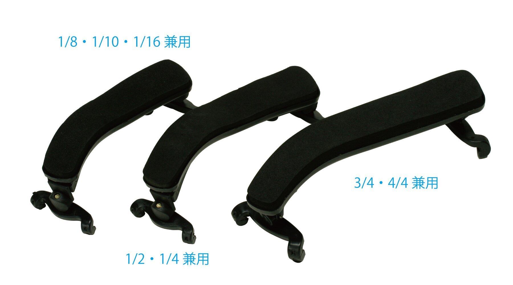 バイオリン用肩当てに1/2サイズと1/8 サイズがラインナップ。1/2 サイズは1/2・1/4バイオリンに、1/8 サイズは1/8・1/10・1/16バイオリンにご利用可能です。現行商品である[VSR-200 4/4(3/4兼用)] と合わせて全サイズに対応が可能になりました。