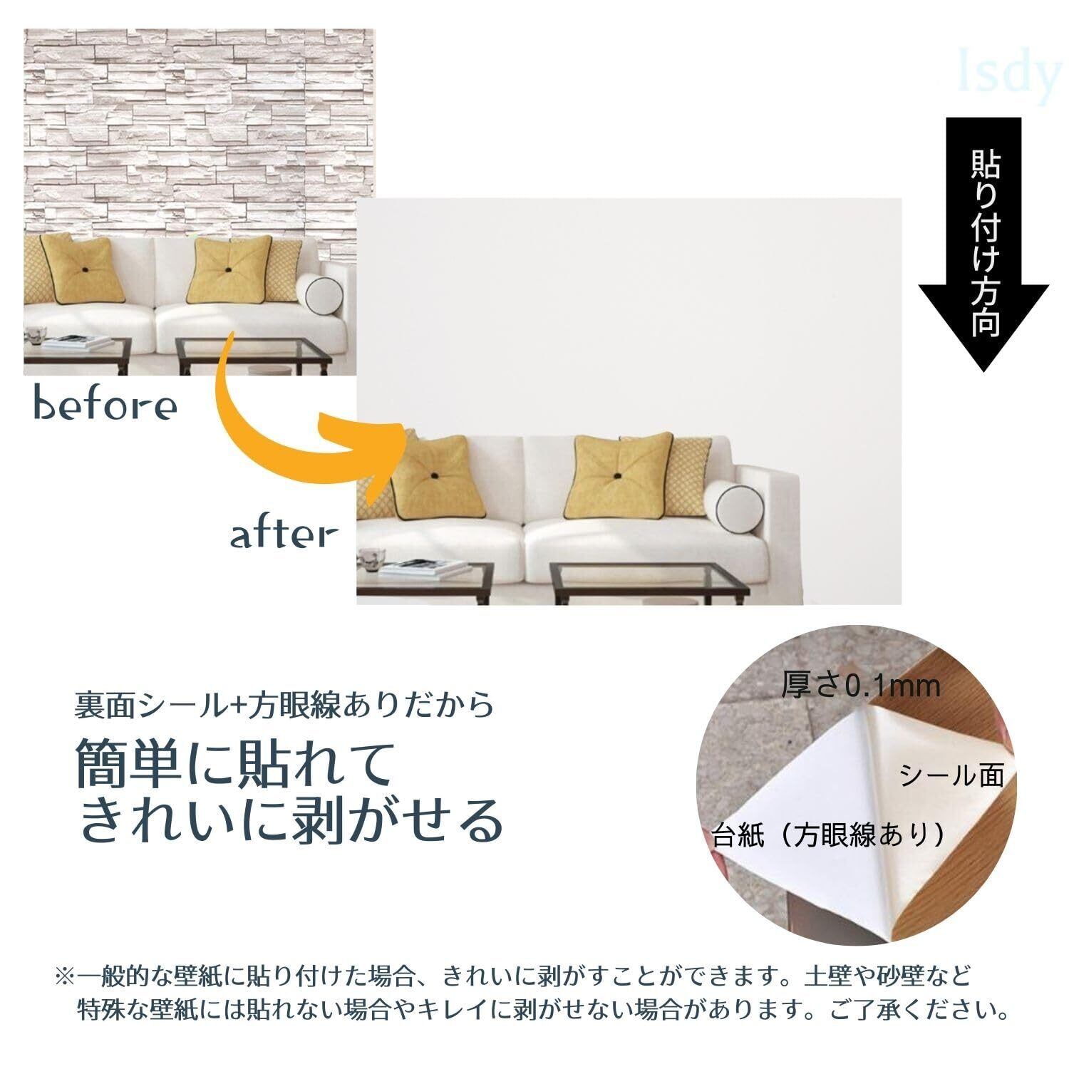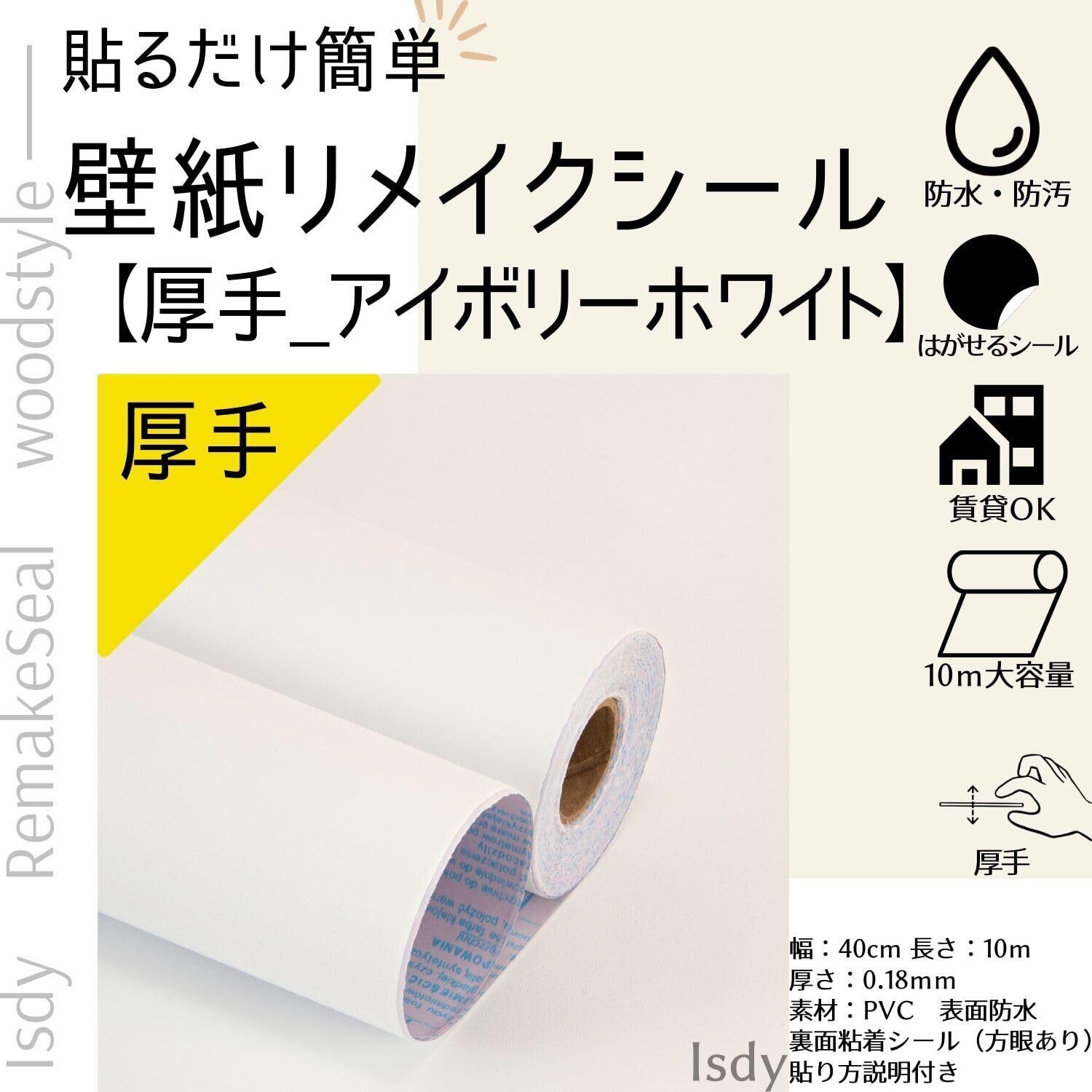 【特価セール】[Isdy] 厚手 壁紙 シール はがせる 壁紙 リメイク シート 無地 キッチン リフォーム ウォール ステッカー カッティング 40cm×10m(厚手_ アイボリーホワイト)