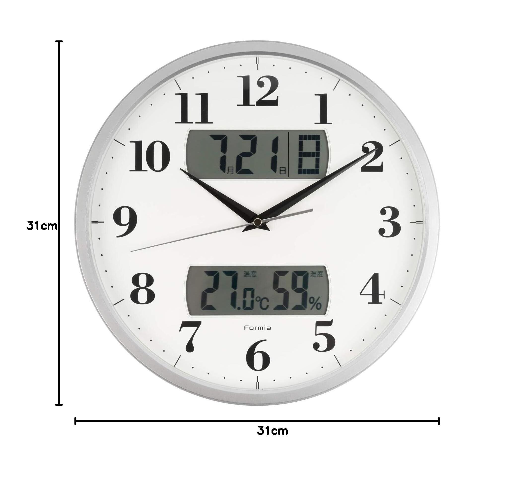 【特価商品】Formia(フォルミア) 掛け時計 時計 壁掛け 電波時計 温度 湿度 温湿度計 日付 カレンダー 曜日 夜間秒針停止 静音 アナログ 会社 オフィス リビング ダイニング 寝室 シルバー