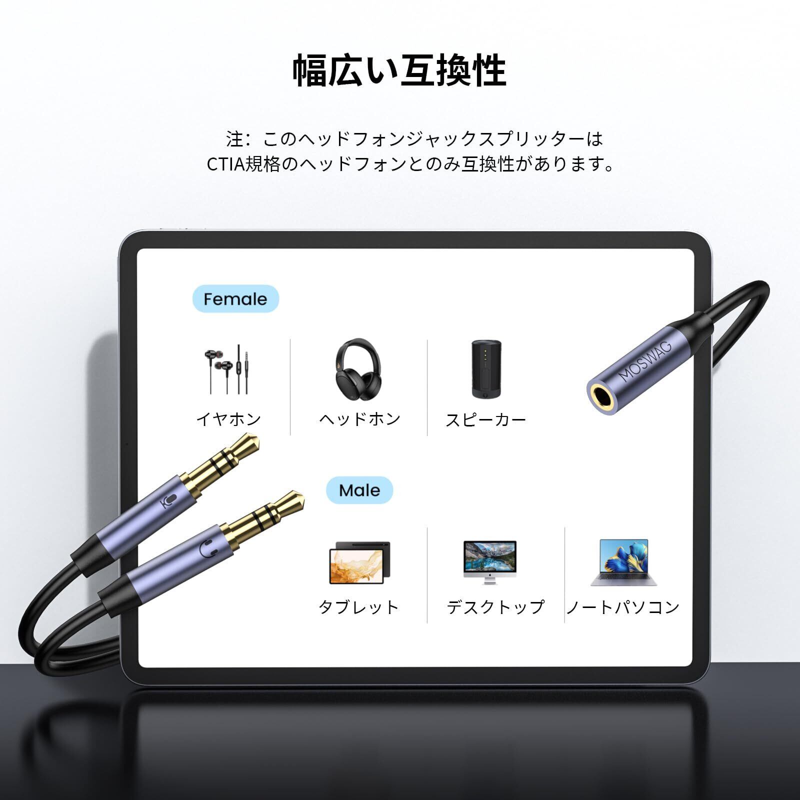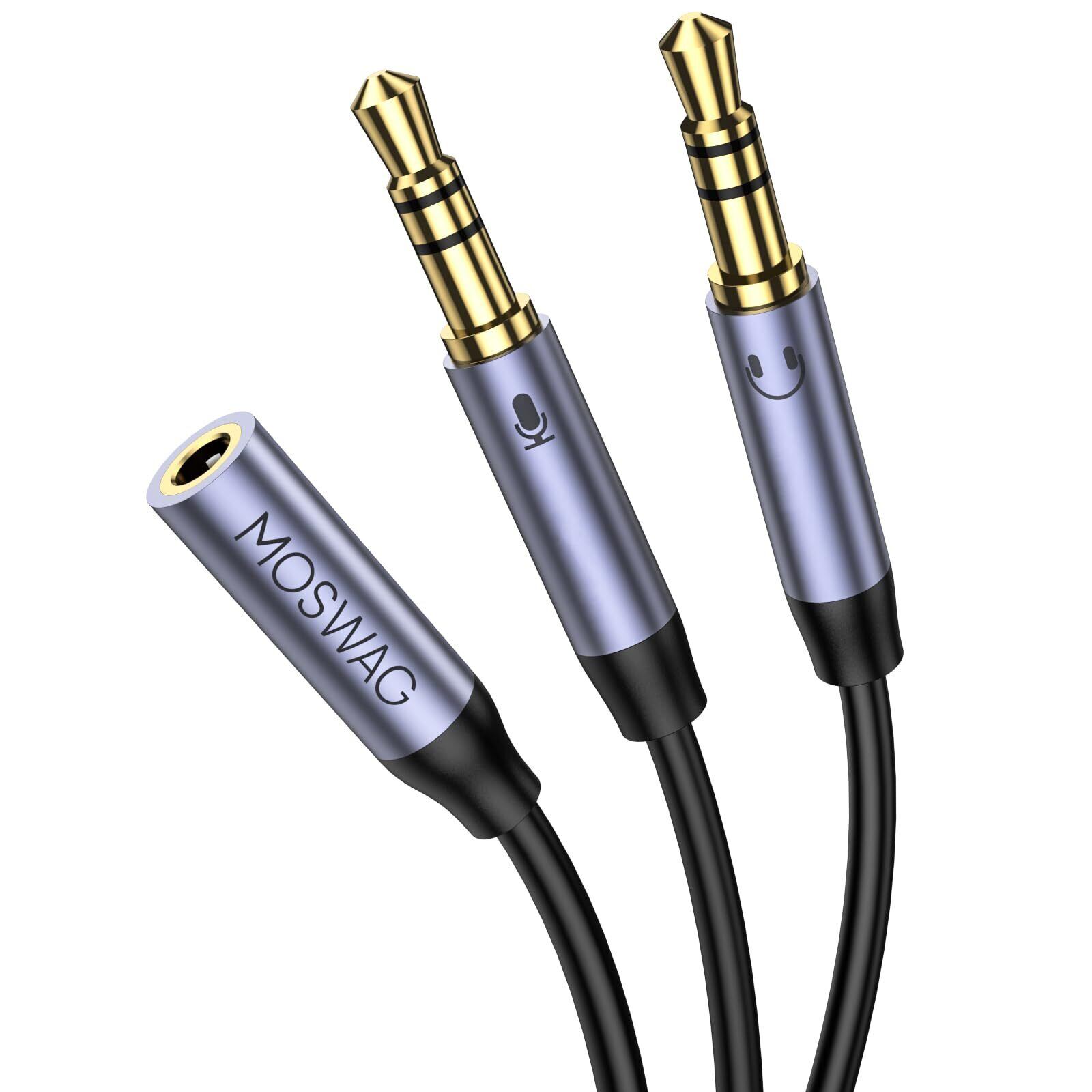 【人気商品】MOSWAG 3.5mm オーディオ分配ケーブル、3.5mm 4極 3極 変換 ケーブル イヤホンジャック 二股 オーディオ変換ケーブル 4極(メス) -3極(オス*2) Hi-Fi音質再生 多重シールド 高耐久性ナイロン編み 24K金、イヤホンマイクケーブル分岐器メッキ、ノイズ低減機能付き、ノートパソコン/スピーカー/マイクに適用する