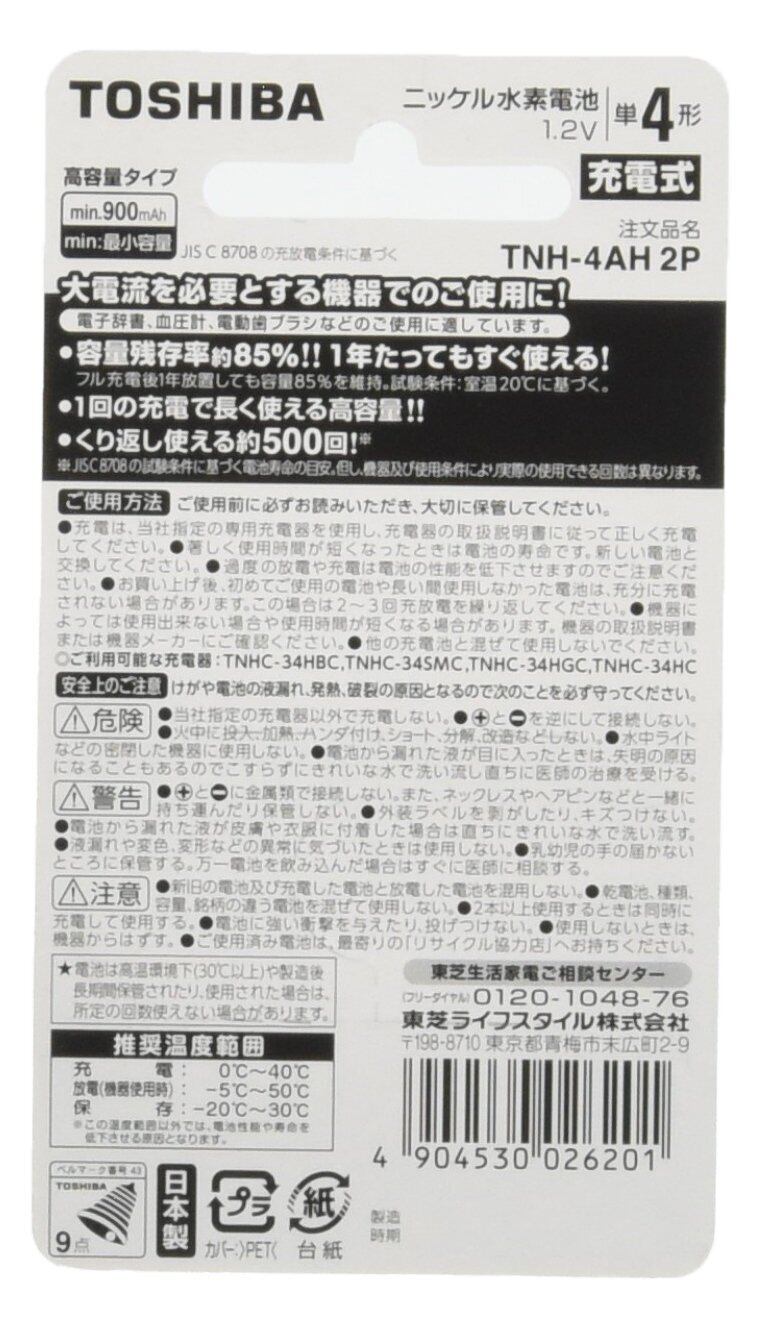 【在庫処分】TOSHIBA ニッケル水素電池 充電式IMPULSE 高容量タイプ 単4形充電池(min.900mAh) 2本 TNH-4AH2P
