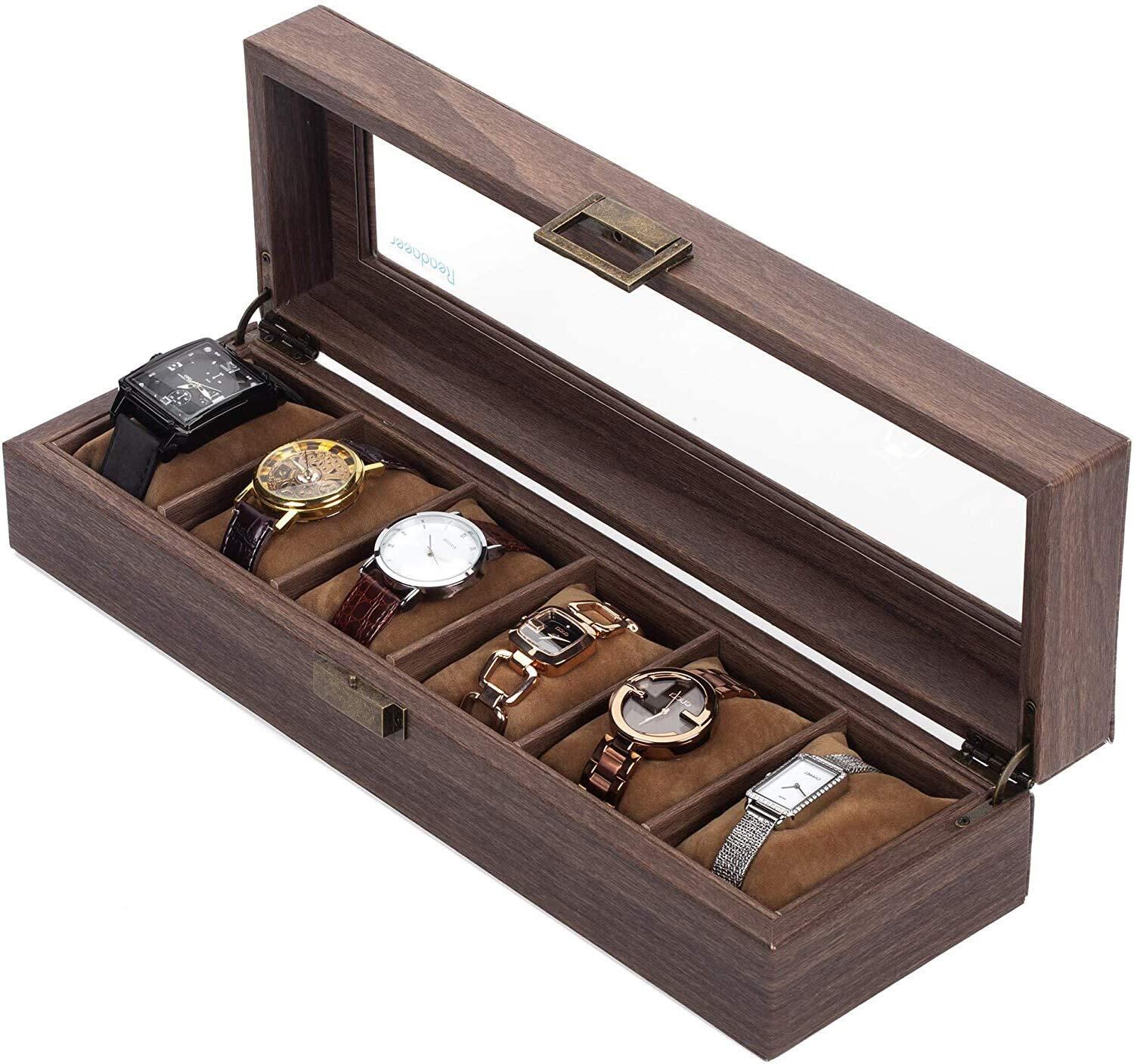 【新春セール】Reodoeer 木目PU 腕時計収納ケース 腕時計収納ボックス コレクションケース ウォッチボックス ガラス天板 6本用