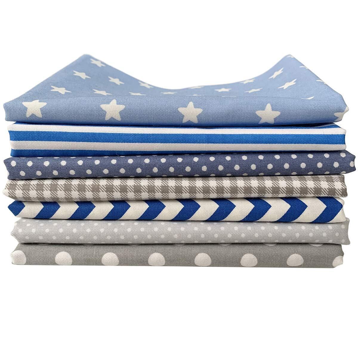 【特価商品】7枚 グレー&ブルー生地 布 大柄 綿100% 手芸 手作り 布地 セット 46×56cm ドット・星・チェック・波線 | KURASHILABO