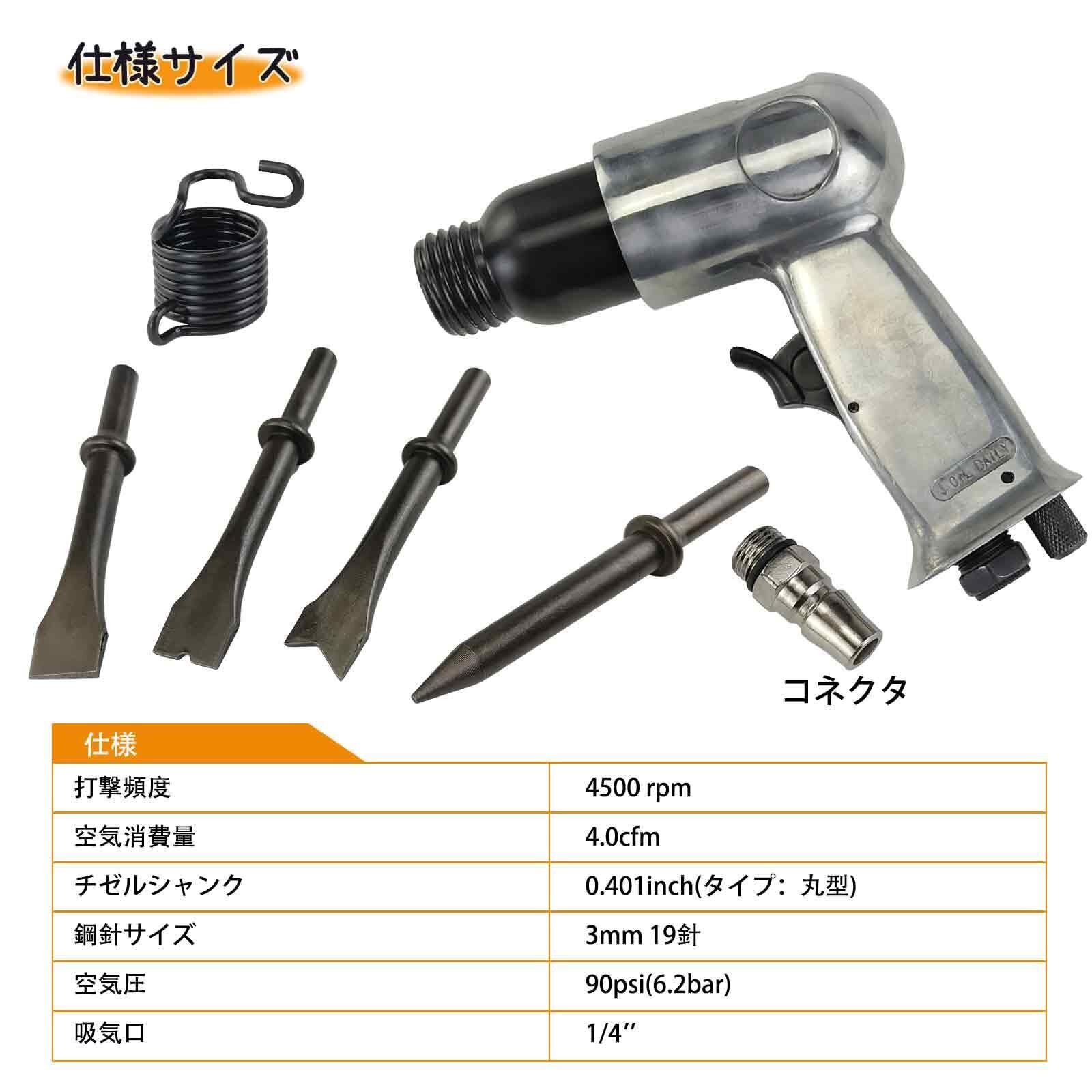 【人気商品】エアハンマーチゼルセット 150mmエアハンマー エアチゼル エアツール スプリングハンマー (チゼル4本付属)・毎分4500打撃・空圧式ハンマーショベル工具