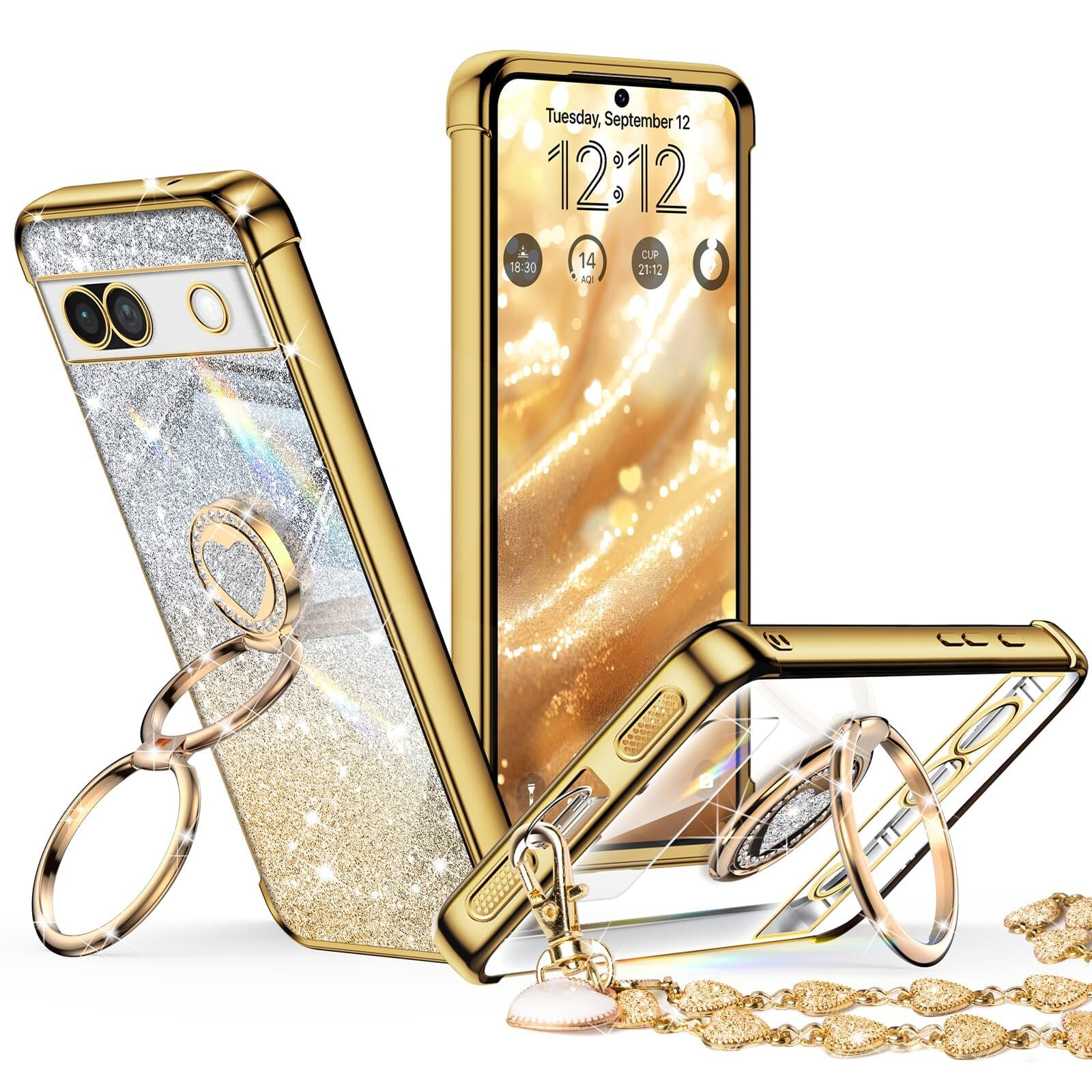 【2022最新】Rockaway 互換性 Pixel 7A 5G 用ケース ダブルリング付き リストバンド ブレスレット付き ストラップ 耐衝撃 薄型 軽量 紐付き キラキラ ラブハート かわいい 女の子 おしゃれ 豪華 スマホケース ピクセル7A 用カバー - ゴールド | KURASHILABO