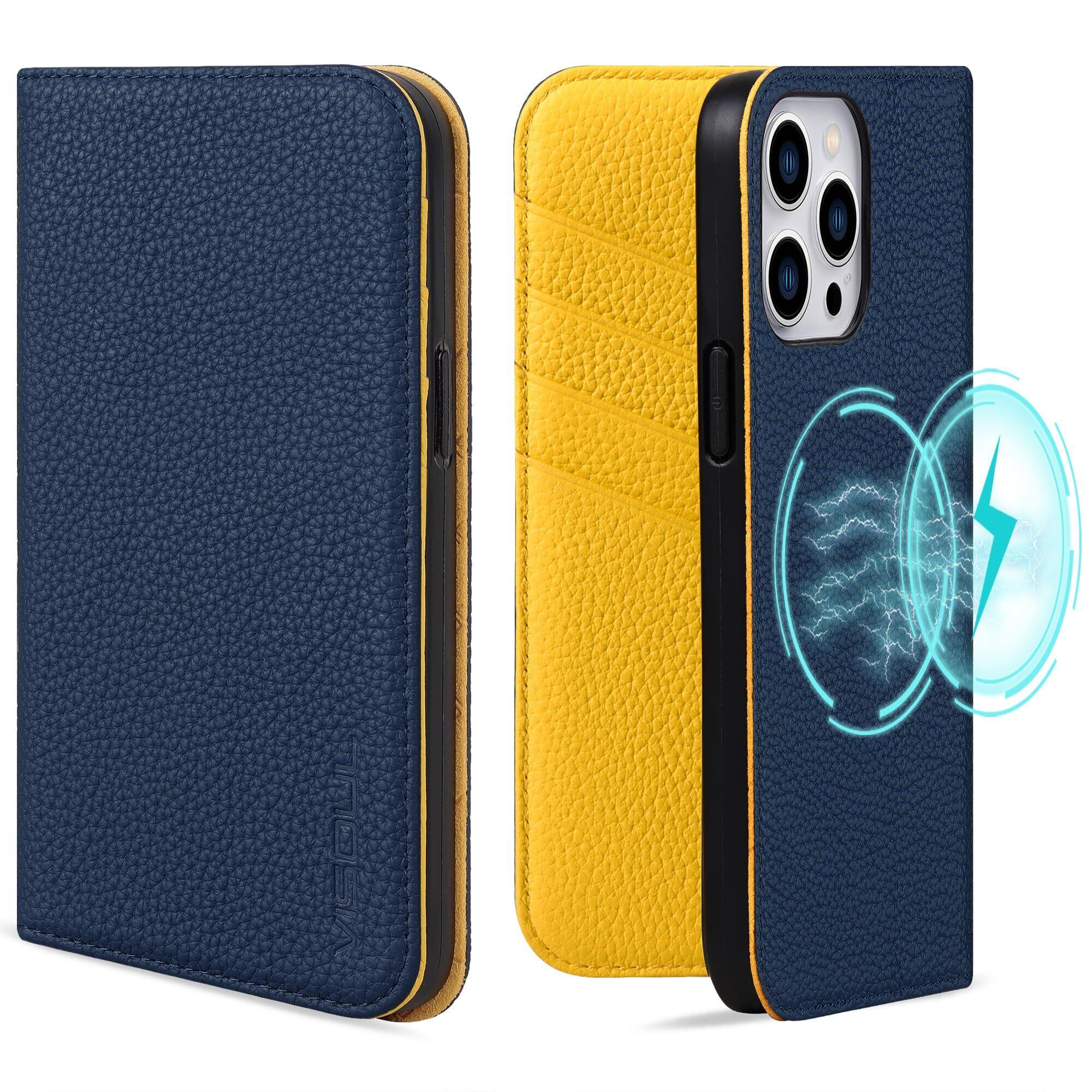 【新春セール】VISOUL iPhone 15 ProMax 対応 ケース 手帳型 本革 アイフォン15 ProMax レザーケース MagSafe対応 全面保護 マグネット式 カード収納 横置きスタンド 6.7インチ アイホン15 ProMax ネイビー レモン