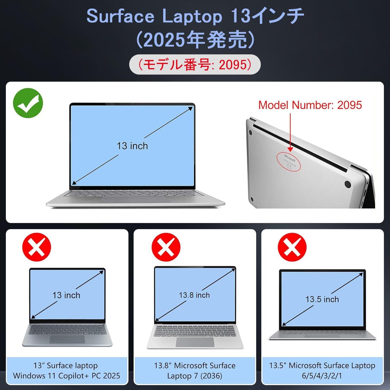 【対応機種】 13インチ Surface Laptop 2025年発売 (モデル番号:2095)※必ずご注文前に対応機種とモデル番号(xxxx)をご確認ください。モデル番号はSurfaceの底面に記載されています。注意:このケースは、13.5/15インチのSurface Laptop、Surface Bookシリーズ、Surface Proシリーズ、Surface Goやその他のデバイスには適していません。