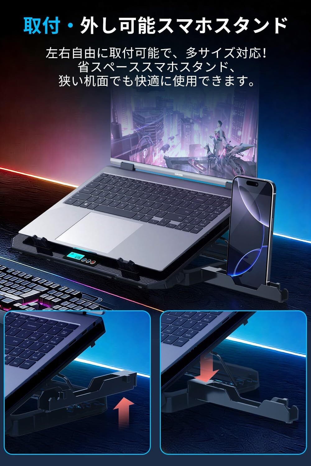 【6段階風速調整&LED画面表示】本ノートPCクーラー は革新的な6段階風速調整技術を採用し、「+、ー」ボタンを押すだけで、静かな風と強力な風を調整することができます。LED表示付きで動作モードが目視で確認できます。