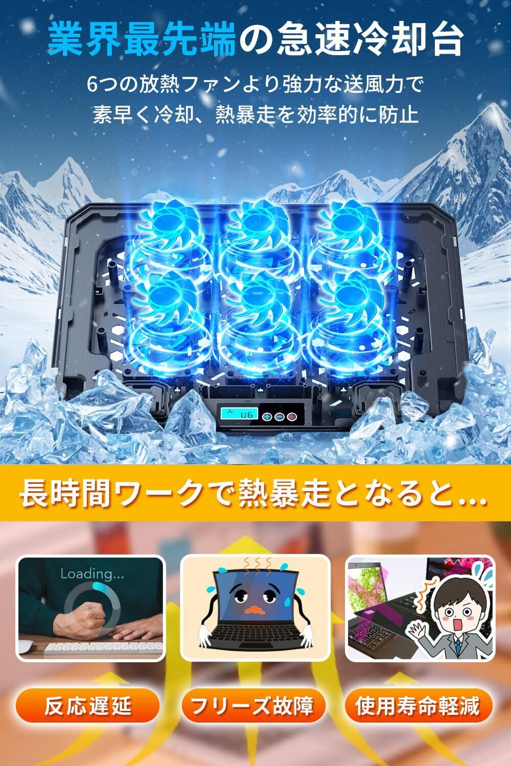 『2026新登場・強力 冷却ファン』 ノートパソコン冷却パッド 冷却台 6つの冷却ファン搭載 4段階高度調整可 6段階風量調節 3つ送風モード ノートPCクーラー pc冷却スタンド 2つUSBポート 大風量・低騒音 滑り止め付 16インチ以内のノートパソコンやタブレットに対応 オフィス/在宅勤務/出張用