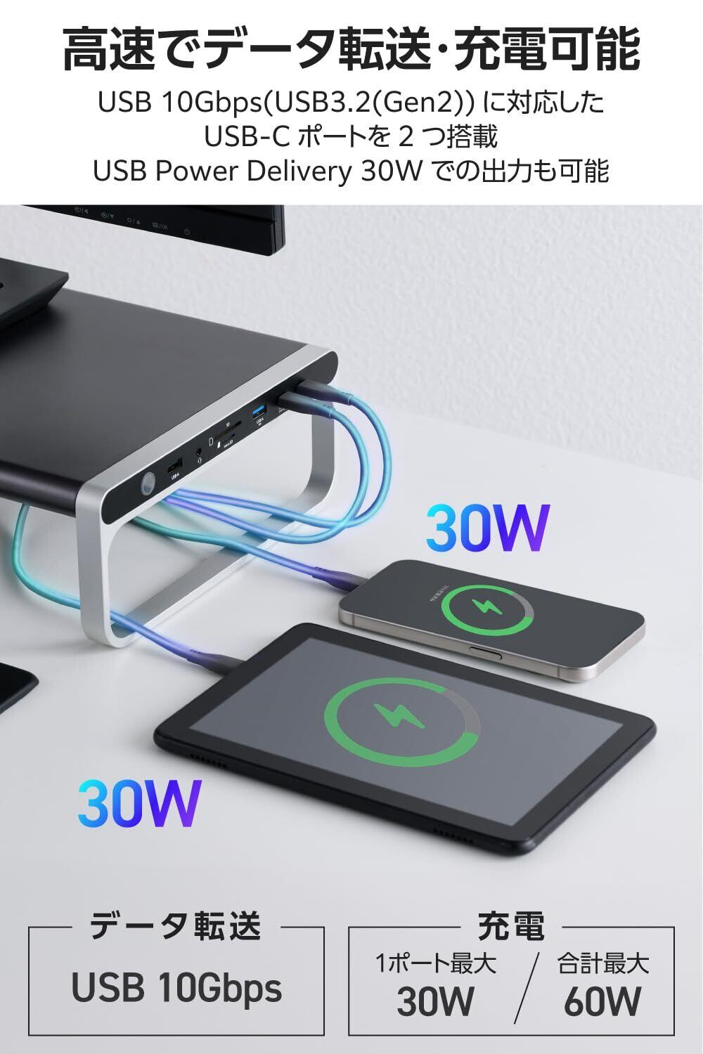 USB 10Gbps(USB3.2(Gen2))に対応したUSB Type-C(TM)ポート×2を搭載しています。高速データ転送が可能なほか、USB Power Delivery 30Wでの出力が可能。同時に接続しても合計最大60Wの出力ができるため、スマートフォンやタブレットの高速充電を実現します。