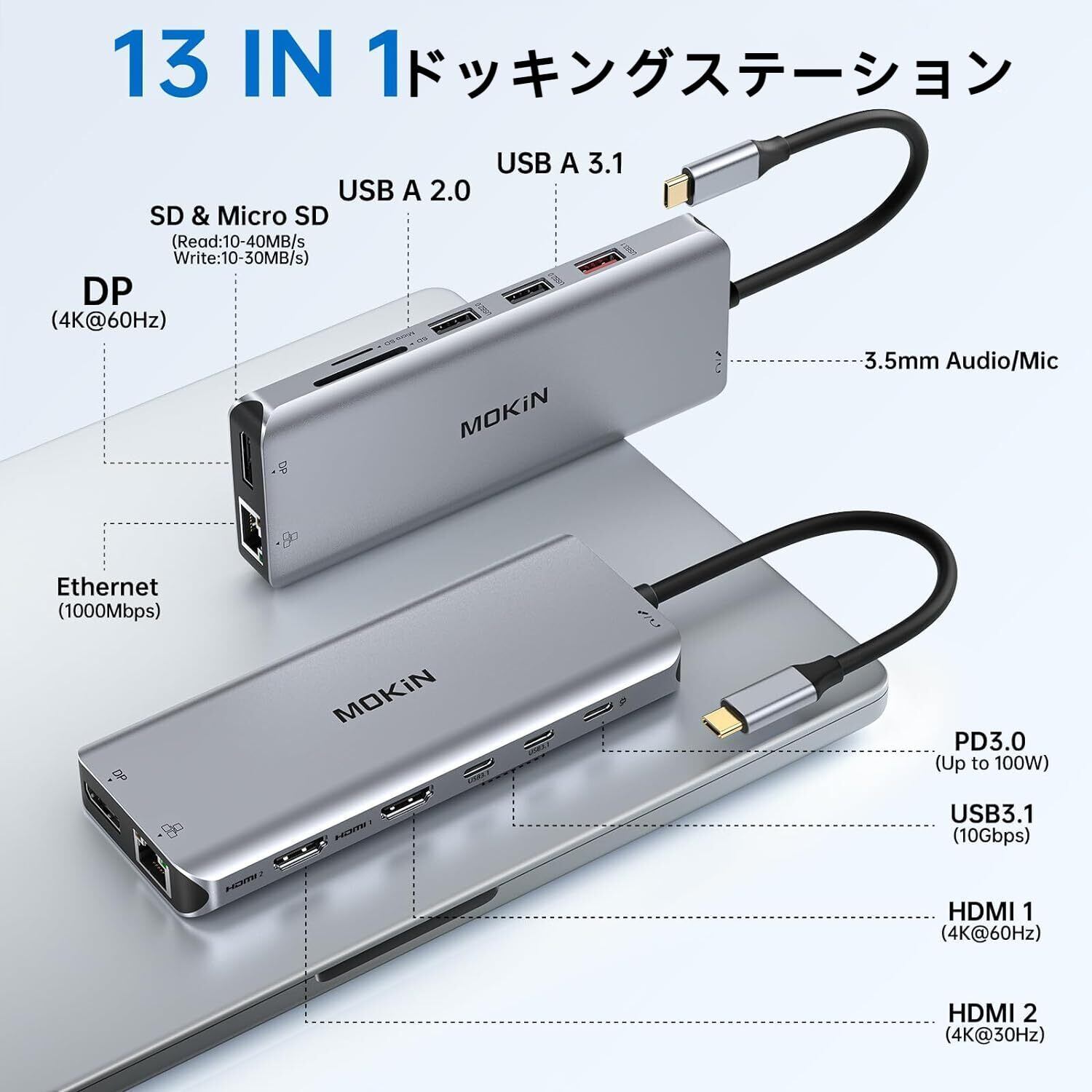 MOKiN USB Cドッキングステーション type c ドッキングステーション3画面出力【2*HDMI+DP】13 in 1usb c ハブ アルミ製良好な放熱性 100W電力出力 6*USBポート & 1000MbpsRJ45 & 3.5mmオーディオジャック&SD/TFカード読み取りMacBook Pro/Air Dell/HP/Lenovo/Linux向け