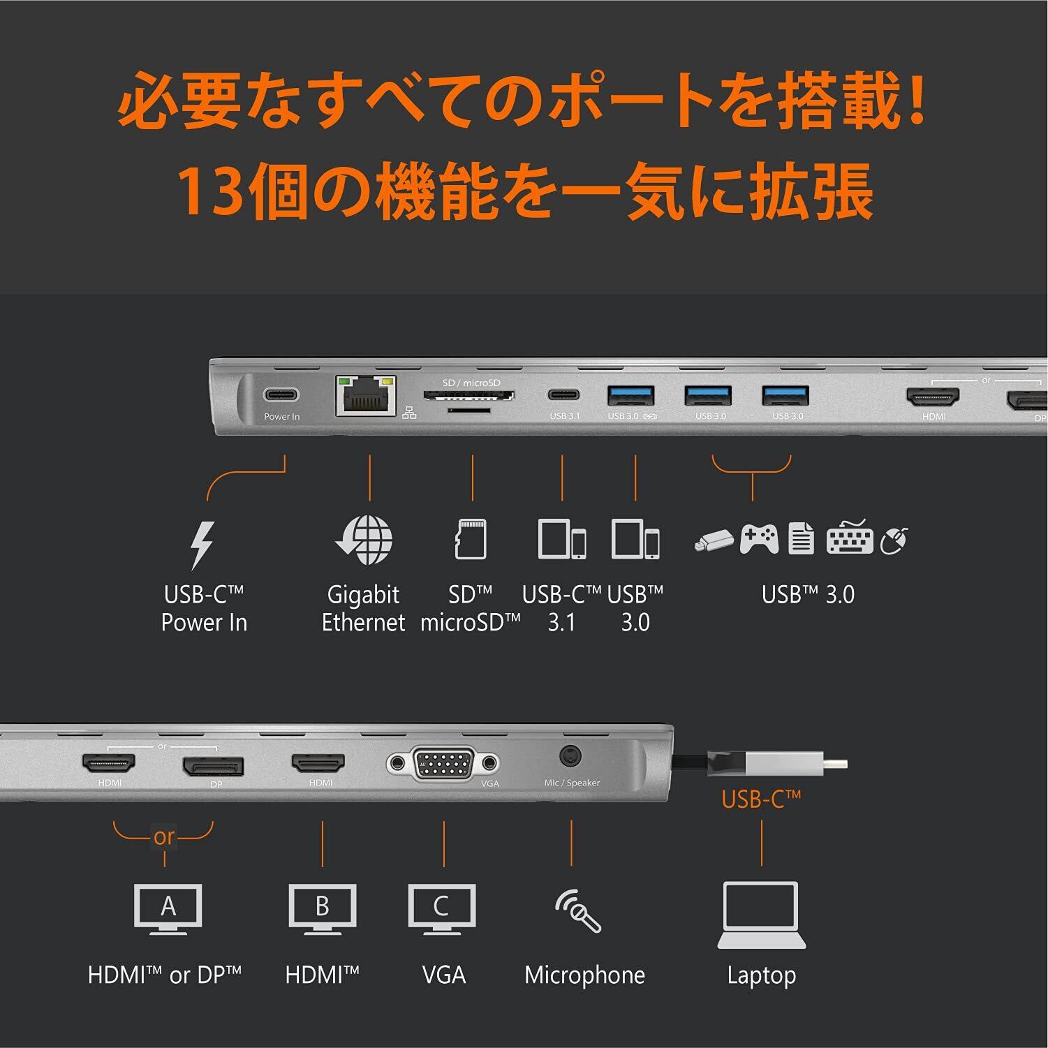 【搭載ポート】USB3.0×3(急速充電2.4A搭載×1)、USB Type-C 3.1×1、USB Type-C Power Delivery 100W 充電ポート×1、4K HDMI×2、DisplayPort×1、VGA×1、ギガビット有線LAN×1(RJ-45)、SDカードスロット×1、MicroSDカードスロット×1、ヘッドセットジャック×1