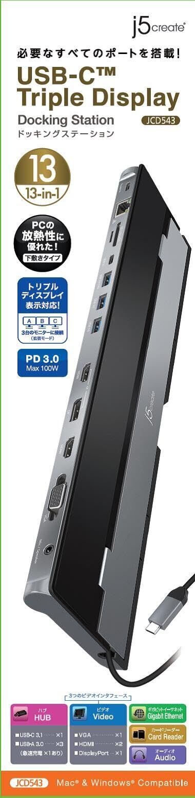 【新春セール】j5create USB C 13in1 ドッキングステーション USB C 4K HDMI 4K DPトリプルディスプレイ USB Ax 3 5Gbps PD100W DisplayPort HDMI VGA LAN SD/MicroSD 3.5mmDP Alt Mode MacBook Pro MacBook Air M1 M2 M3 M4 Pro Max Surface JCD543-EJ