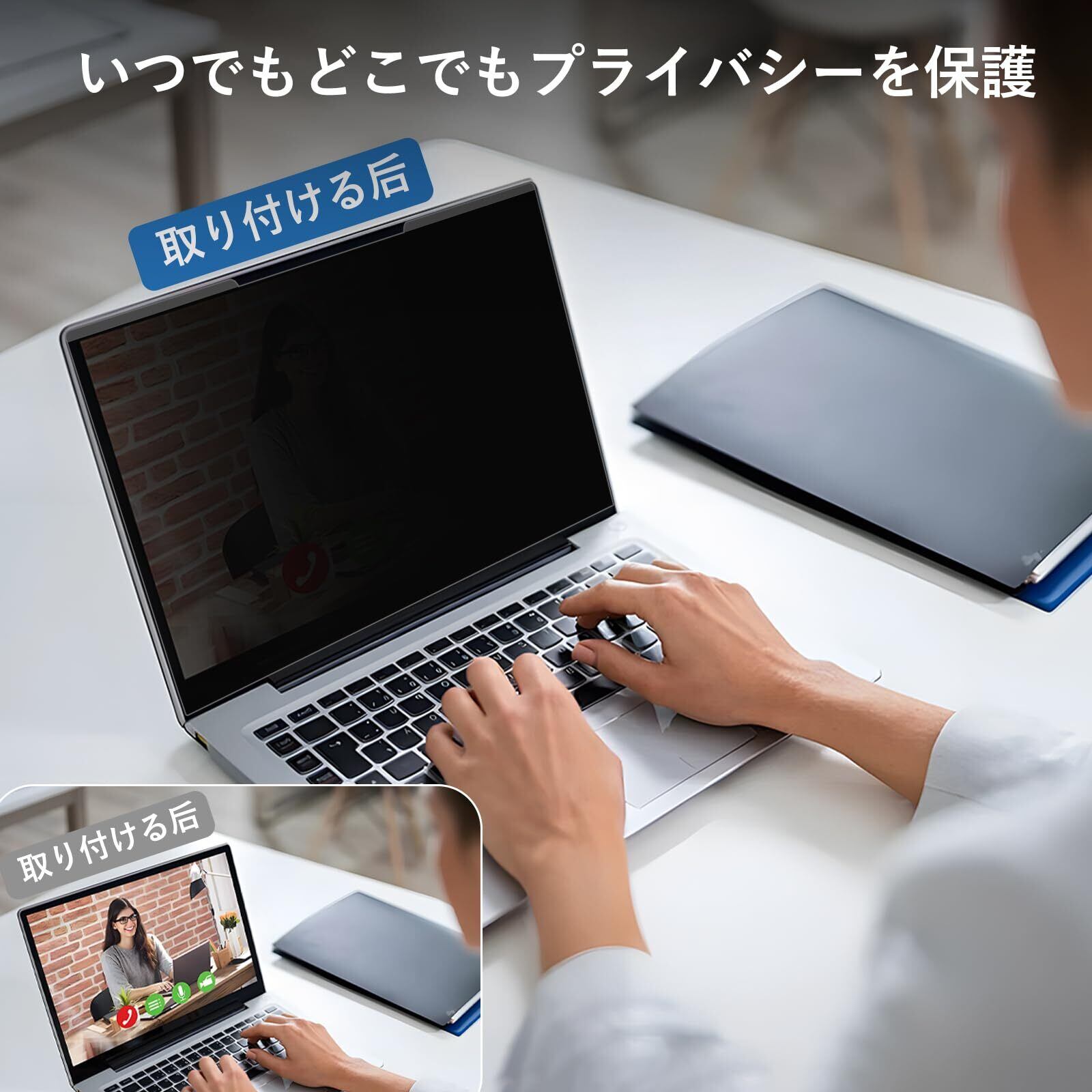[プライバシー保護] 正面からの視認性を保ちつつ、側面からの覗き見を防ぐことができます。約60度の視野角(左右30度)を越えると、画面が暗く表示されるため、新幹線やカフェで作業をしていても情報の漏洩リスクを回避することができます。対応サイズ:14インチ 縦横比 3:2 フィルター部分のみの寸法:296mm x 197mm。パナソニック レッツノート Let's note CF-FV1、CF-FV4、CF-FV5、MateBook14 など。※ご注文の前に、お使いのパソコンの画面サイズとアスペクト比が本品と一致するか必ずご確認ください。