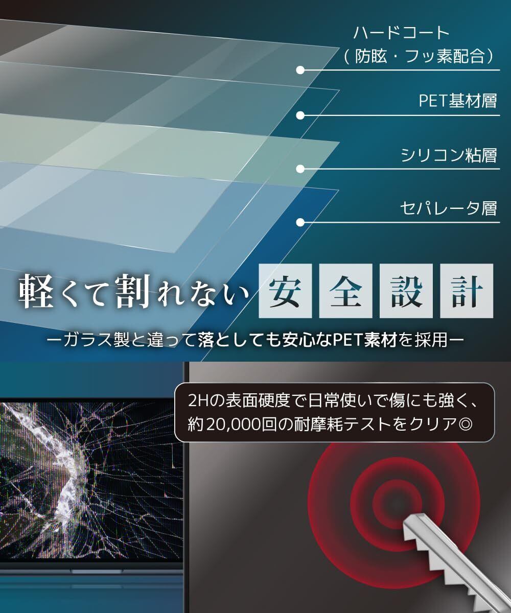 【肌触りもスムース】 表面にフッ素コーティングを施しているので触った感触もスベスベしています。汚れが付着した場合はクリーニングクロスなどでサッと拭き取るだけで綺麗を保てます。 厚さ0.15mmと薄くてもスクラッチ(傷)に強く、スクリーンの擦り傷防止用にフィルムを貼っているだけでも安心です。