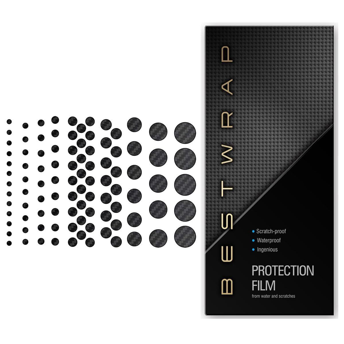 【安心の日本製】 製造から販売まで日本国内でおこなっております。 【傷防止加工】 表面はエンボスやカーボン模様が施されており傷がつきにくくなっております。 【貼り付け方法】 ピンセットや爪楊枝などで貼り付けてください。 【注意】 一度剥がしたシールは再利用できません。 【各枚数】 φ2mm 13pcs , φ2.5mm 13pcs , φ3mm 10pcs , φ3.5mm 9pcs , φ4mm 9pcs , φ5mm , 26pcs , φ6mm 14pcs , φ8mm 6pcs , φ10mm 5pcs , φ12mm 5pcs 【仕様】 0.1mm厚 材質:PVC 日本国内製造 合同会社BESTWRAP