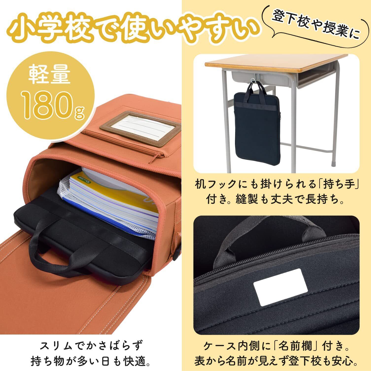 【特長2】机フックにも掛けられる持ち手つき・雨の日も安心の止水ファスナーつき・ケース内側に名前らん付き