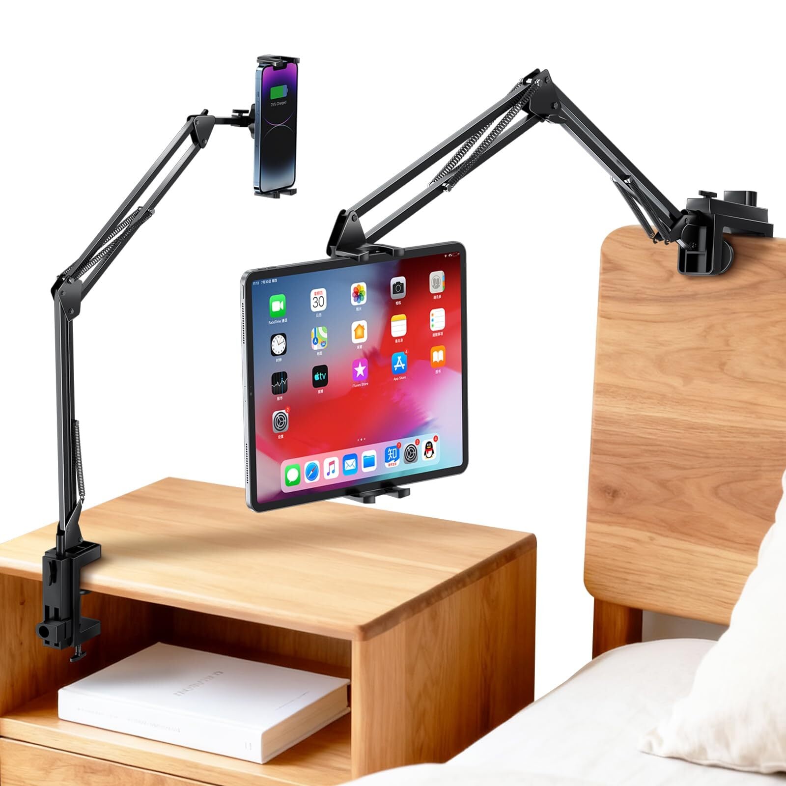 タブレット スタンド 寝ながらタブレット アーム【2026最新型・炭素スチール製・ケーブル固定具付き】4〜15.6インチ対応 ホルダー 折り畳み式 360°回転 自由角度調整 ベッドサイド取付 iPad/iPhone/Kindle/Switch/Surface/Galaxy対応