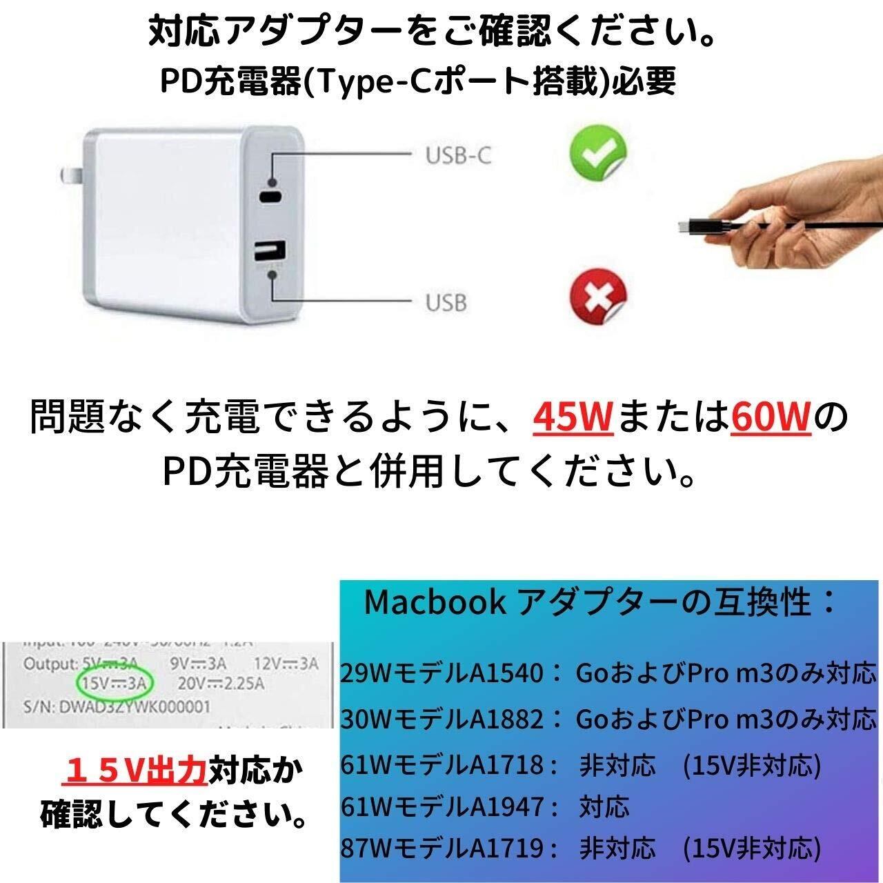 一部のApple PD充電器は45w、15v出力がないためケーブルには使用できません。規格に合った充電器を使用しない場合、このsurface充電ケーブルは使用できません。