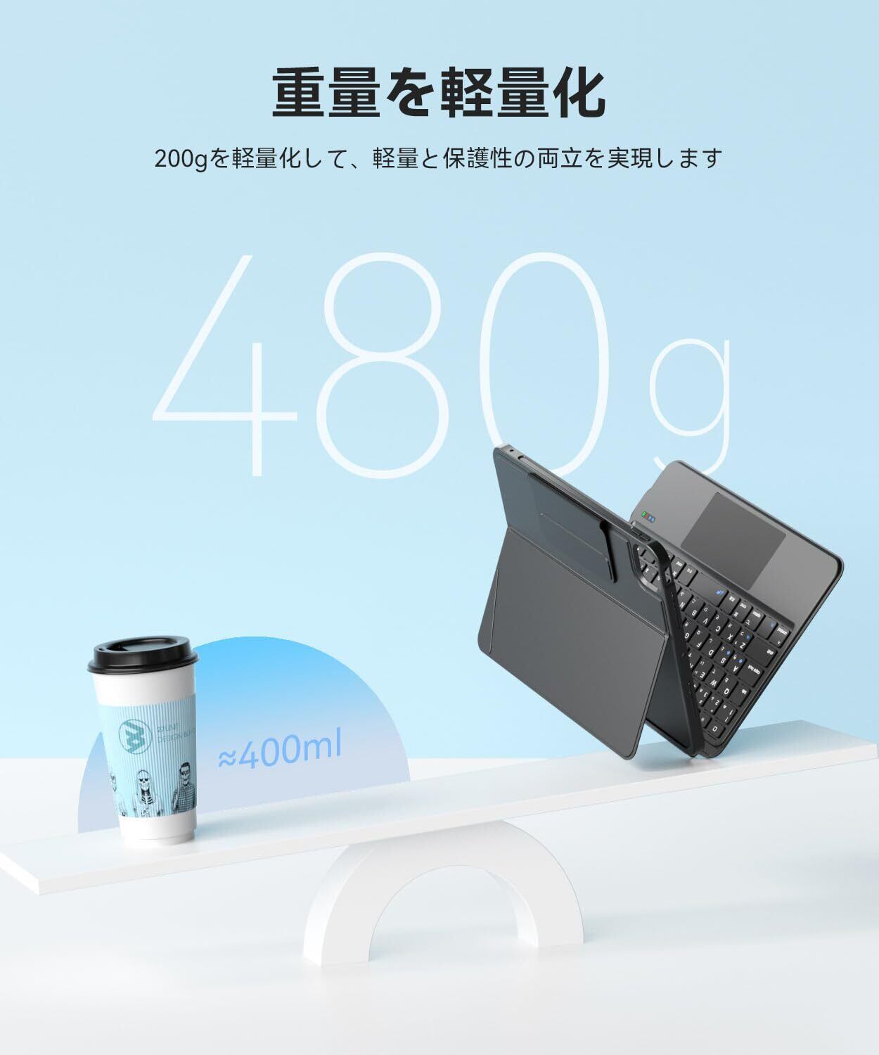 【革新JIS標準日本語配列& 超軽量】ipad a16 キーボード はJIS規格準拠の日本語配列を採用し、大型Enterキー、左右shiftキー、左右cmdキー搭載、各種記号キーも見慣れた場所に配置により、お使いのキーボードから違和感なく移行できます。また、キーの素材を革新し、キータッチ音が格段に小さくなり、静かな図書館や会議室、深夜の作業など、静かな環境での使用に最適です。わずか480g、バッグに入れてもかさばらず、片手で簡単に持ち運べます。
