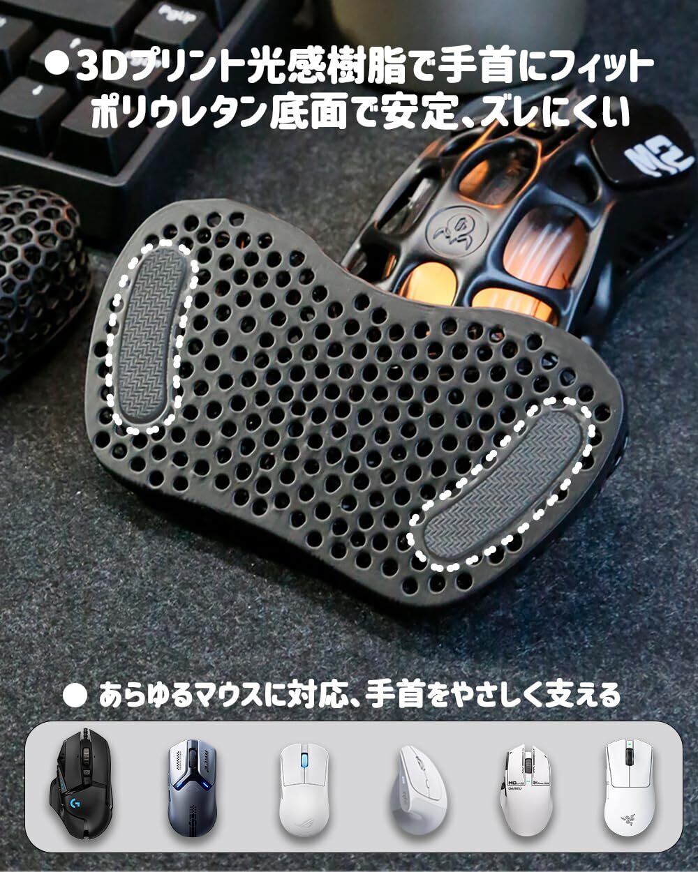 【革新的ハニカム構造で、蒸れにくく一年中快適】3D立体のハニカム構造により、内部に空気の通り道を確保。手首まわりの熱や湿気を逃がし、長時間のPC作業やゲーム中でも蒸れにくく、さらっとした使い心地を保ちます。夏場はもちろん、季節を問わず快適な作業環境をサポートします。