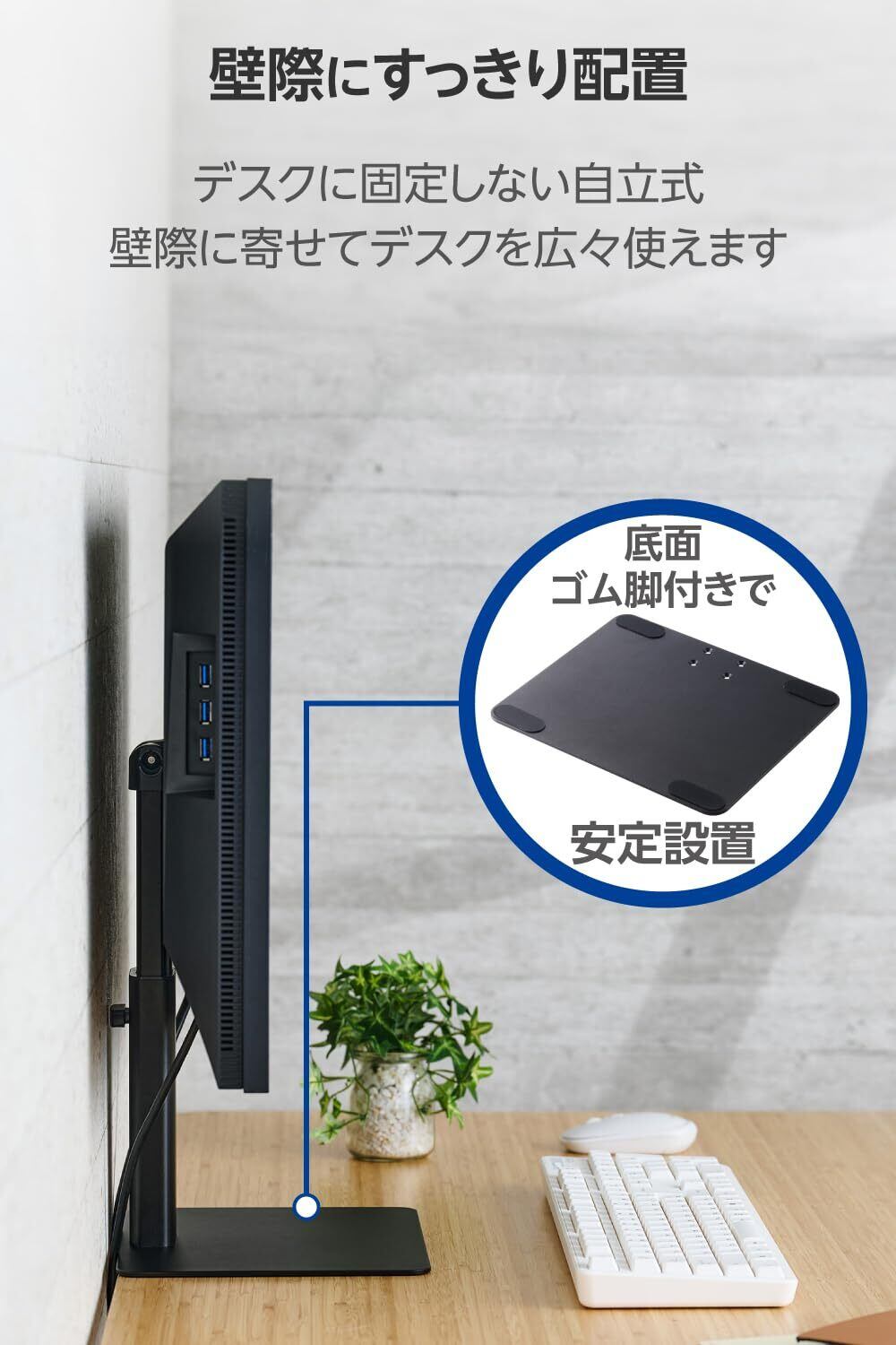 縦方向に最大180度の角度調整が可能。視線や姿勢に合わせて、見やすい角度にしっかり固定できます。展示用モニターの設置にも便利です。※付属されている六角レンチで定期的にマウント部のボルトを締め直してください。 ※ケガや破損を防ぐため、角度や高さ調整の際は必ず両手で行い、調整後にモニターを設置してください。