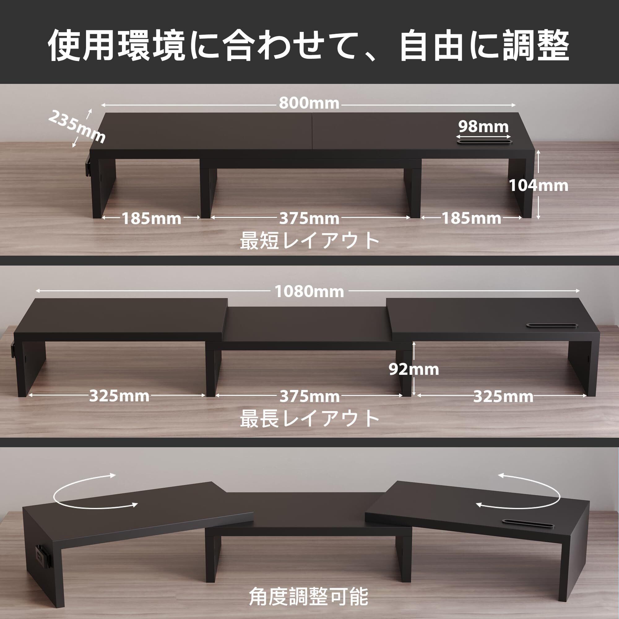 【伸縮80-108cm 角度調整 耐荷重40kg】モニタースタンドは幅80cmから108cmまで伸縮でき 角度調整で画面の向きと間隔を整えやすい 机上台 デュアルとしてノートPCと外部モニターを並べてもレイアウトが崩れにくく 置きたい物に合わせて幅を詰めたり広げたりしやすい 耐荷重40kgの安定設計で日常使いに安心 ブラック
