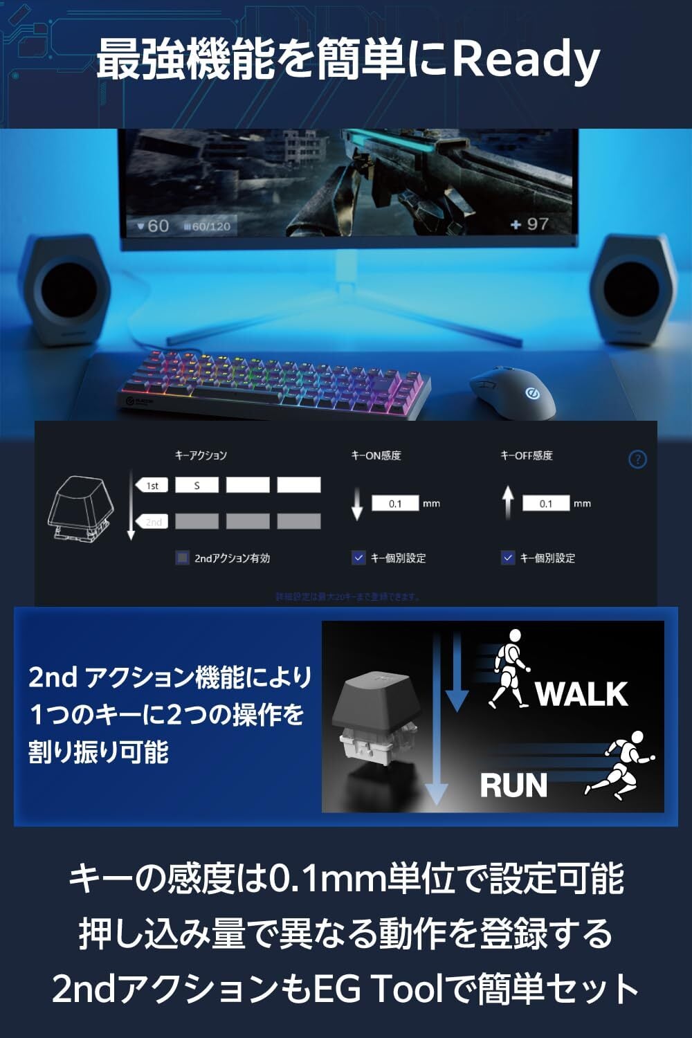 最短0.1mmの押し込み・押し上げでキー入力のON/OFF操作ができる、磁気式アナログ検知スイッチ(磁気スイッチ)搭載の65%サイズゲーミングキーボードです。