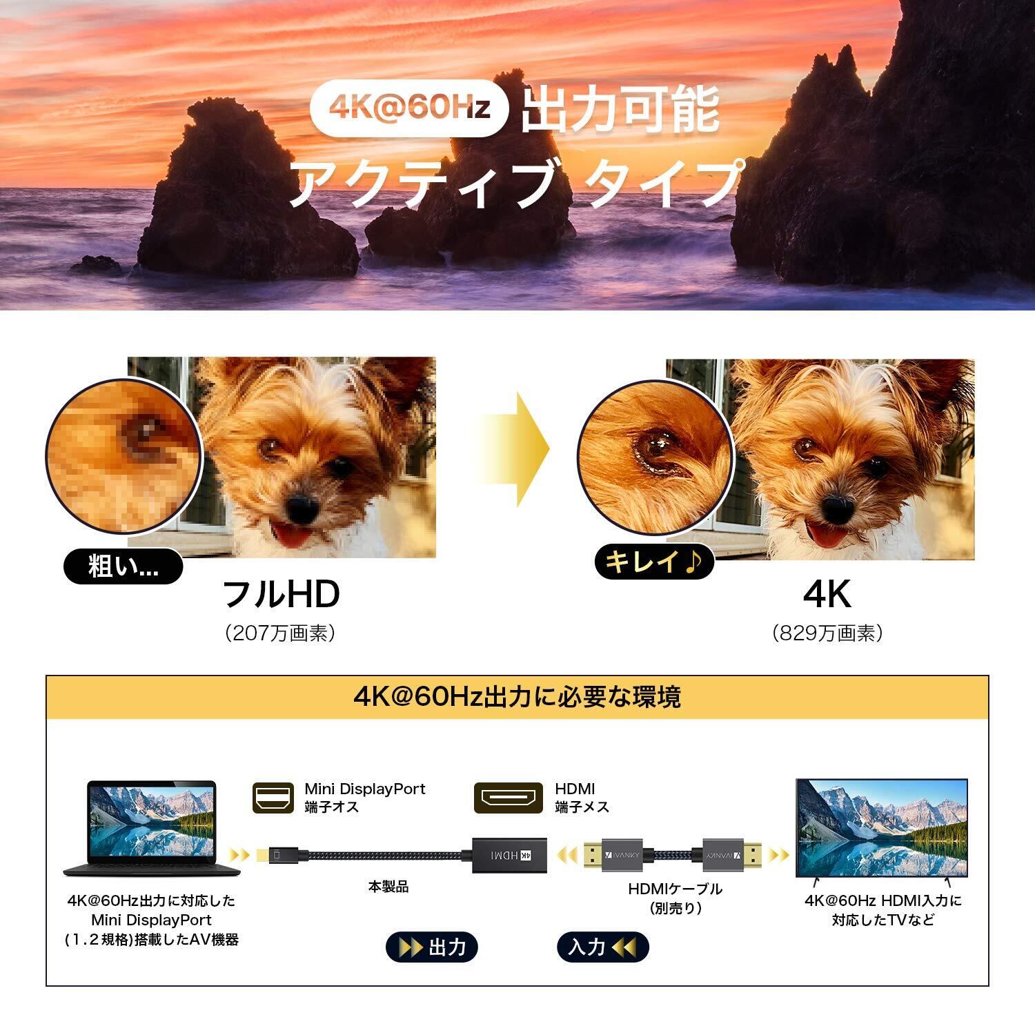 【HDMI変換アダプタ】PC タブレットやノートパソコンとモニター、TV テレビ、プロジェクターなどを接続する Mini Displayport HDMI 変換アダプタ。HDMI 2.0で解像度が4K@60Hz(4096*2160)までサポートできます。※ご注意:4K出力にはPC・ディスプレイの両方が4Kに対応できる必要があります。