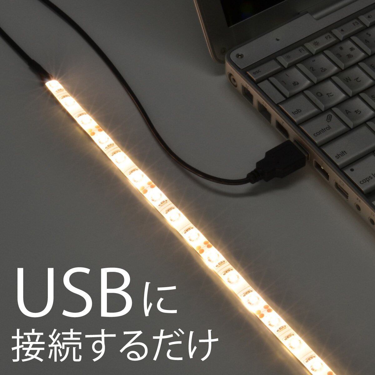 【USBに接続するだけで使えるテープ式LEDライト】本製品は、パソコン等のUSB端子にケーブルを接続するだけでLEDの明かりを灯す事ができる、簡単接続のLEDライトです。使用電力は、わずか2.4W。地球に優しいエコなライトです。