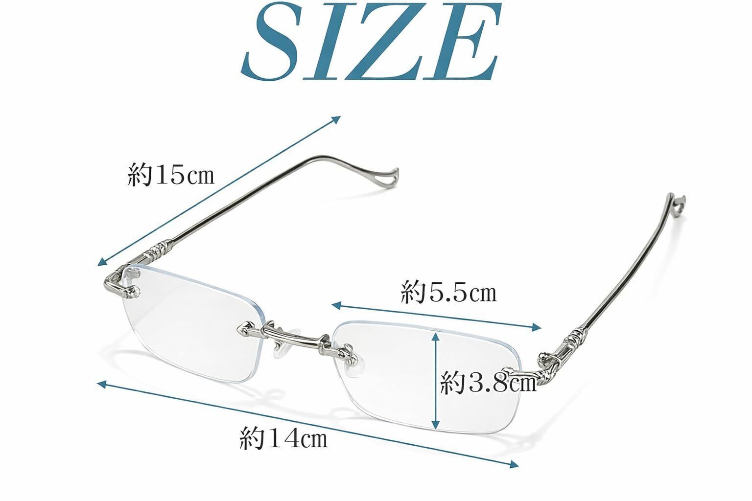 【セット内容】フレームレス眼鏡×1点 【サイズ(約)】14cm×15cm 【カラー】シルバー 【材質】金属