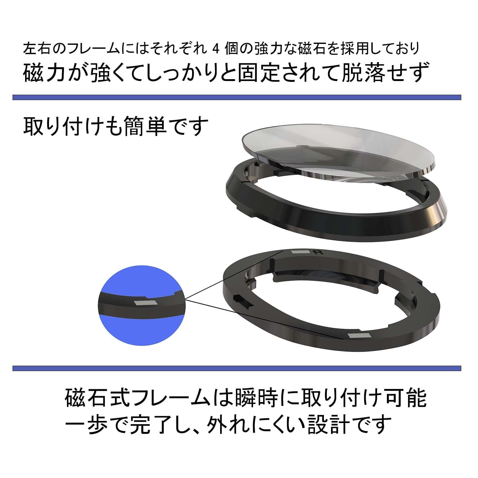 【使いやすさ】Meta Quest 3用の度付きレンズには磁石式マグネットが搭載されており、まずレンズフレームを対応する位置にセットし、次にレンズのマークに沿ってフレーム内にセットするだけで簡単に取り付けできます。操作は直感的で手間がかかりません。