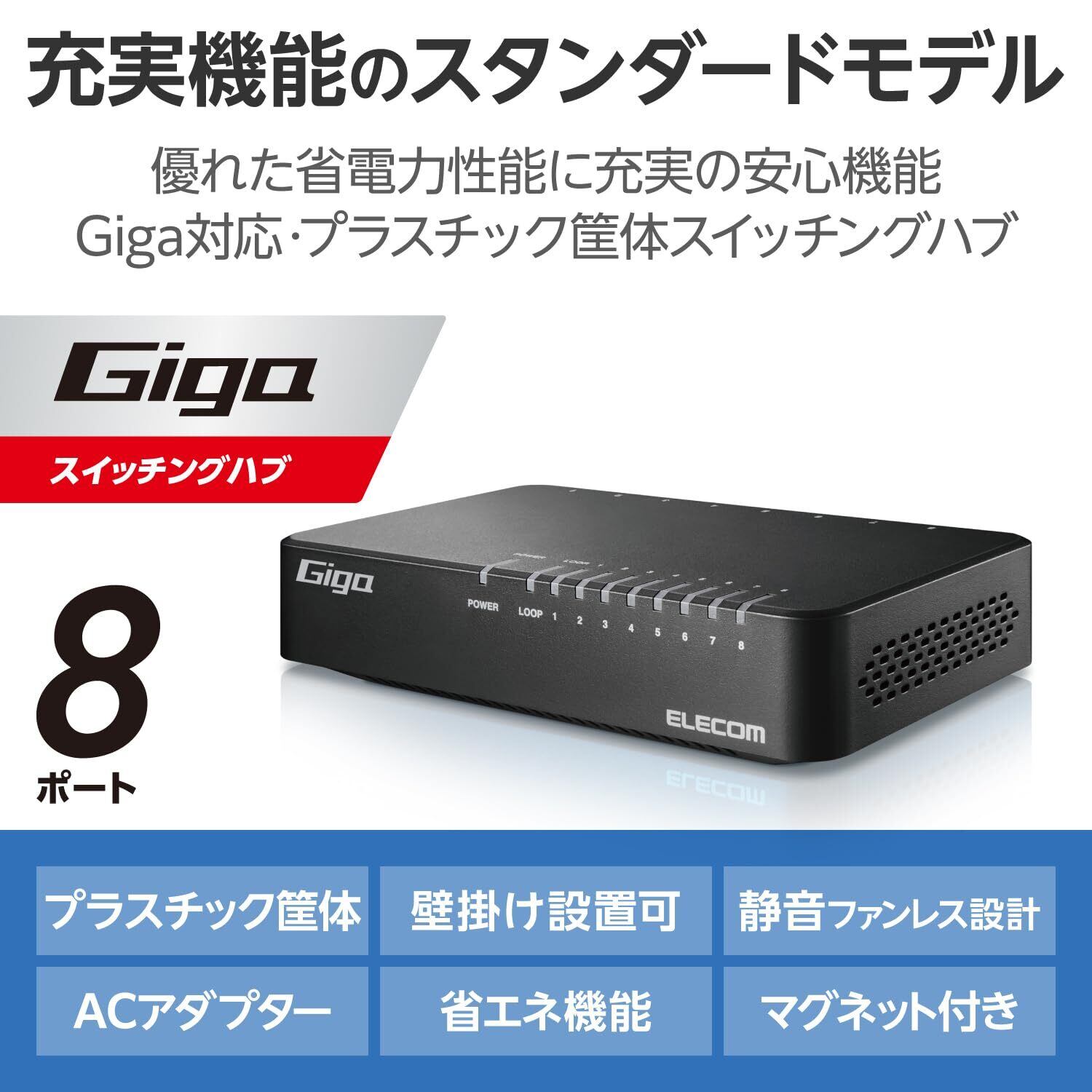 ■Giga(1000BASE-T)対応、ACアダプター電源のプラスチック筐体8ポートスイッチングハブです。