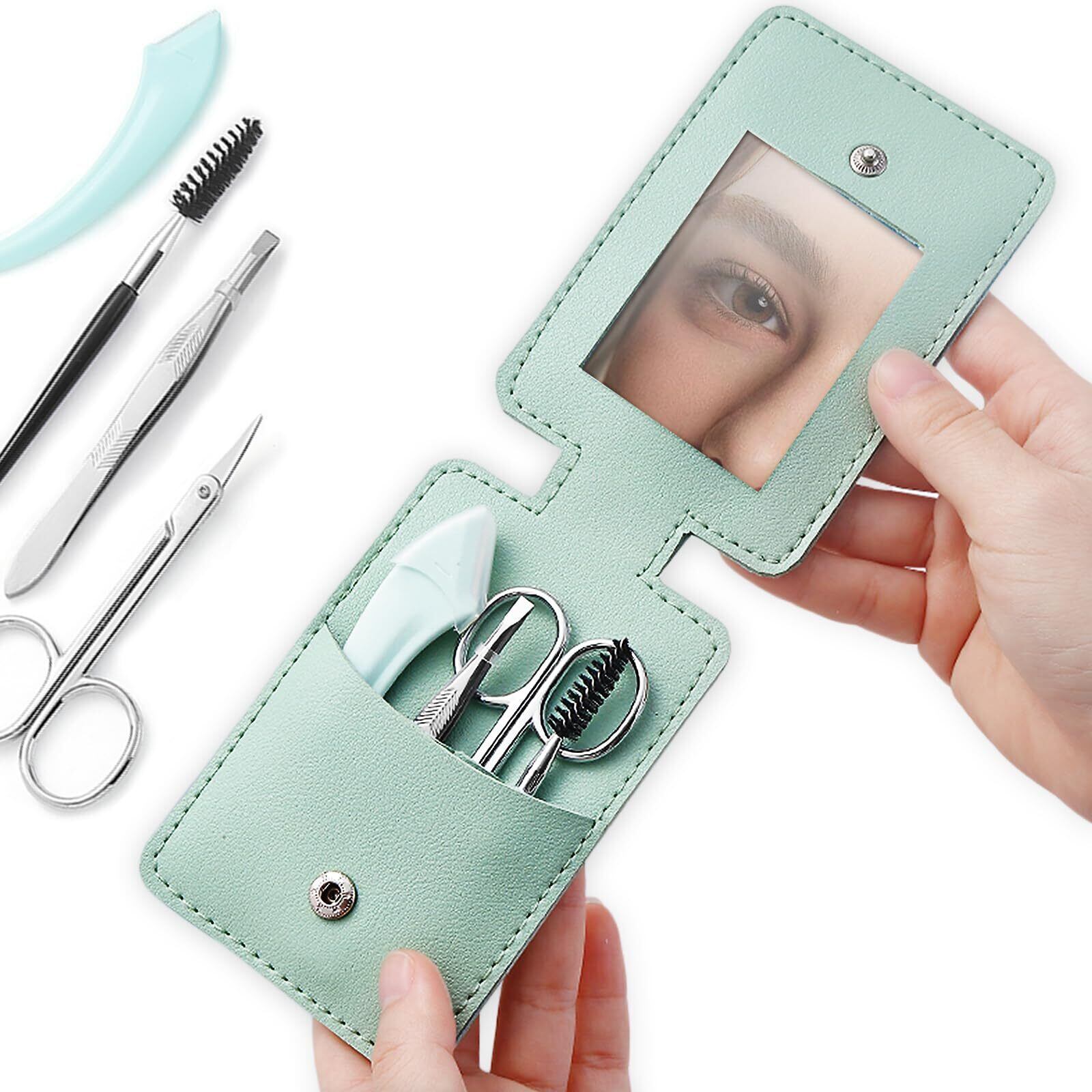 完璧な携帯用セット: 眉毛の手入れに必要なすべてのツールが含まれています。毛はさみ、眉毛ブラシ、ツイーザー、そして化粧鏡付きの高級レザーケース。コンパクトなサイズで持ち運びに最適。化粧鏡付きで、外出先でもフェイシャルの手入れができます。