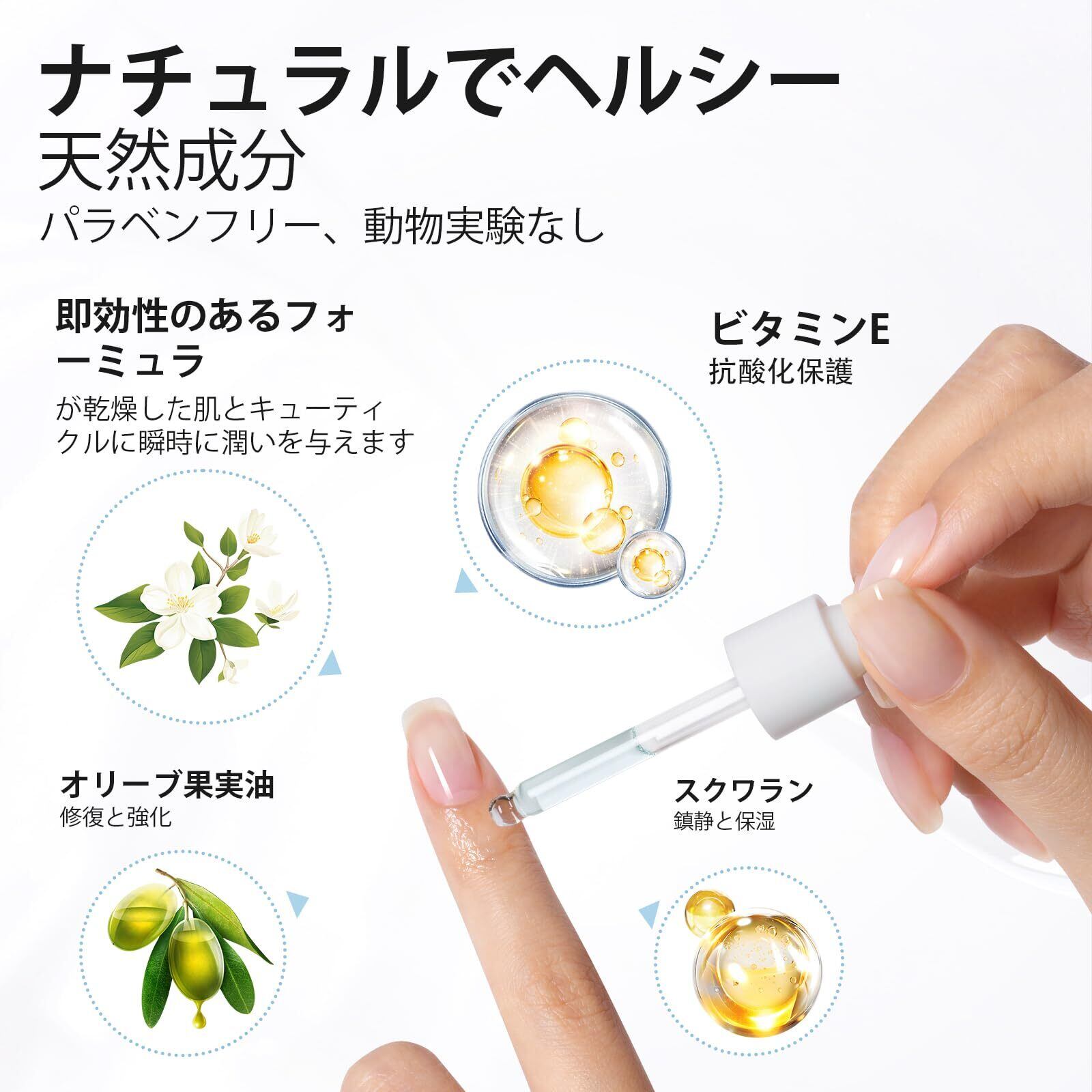 スポイトデザイン:この製品は透明なガラスのスポイトデザインを採用しています。必要に応じて栄養油の量を調節でき、スポイトには横漏れを防ぐデザインも施されているため、持ち歩いても漏れる心配がありません。