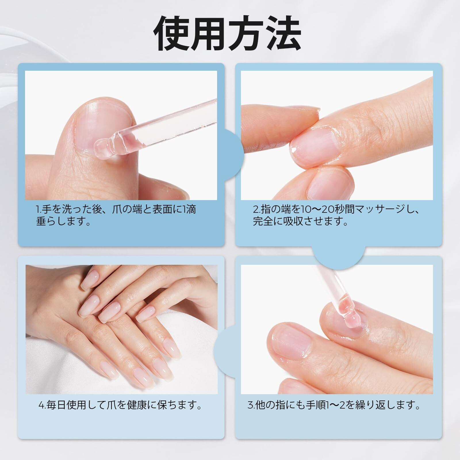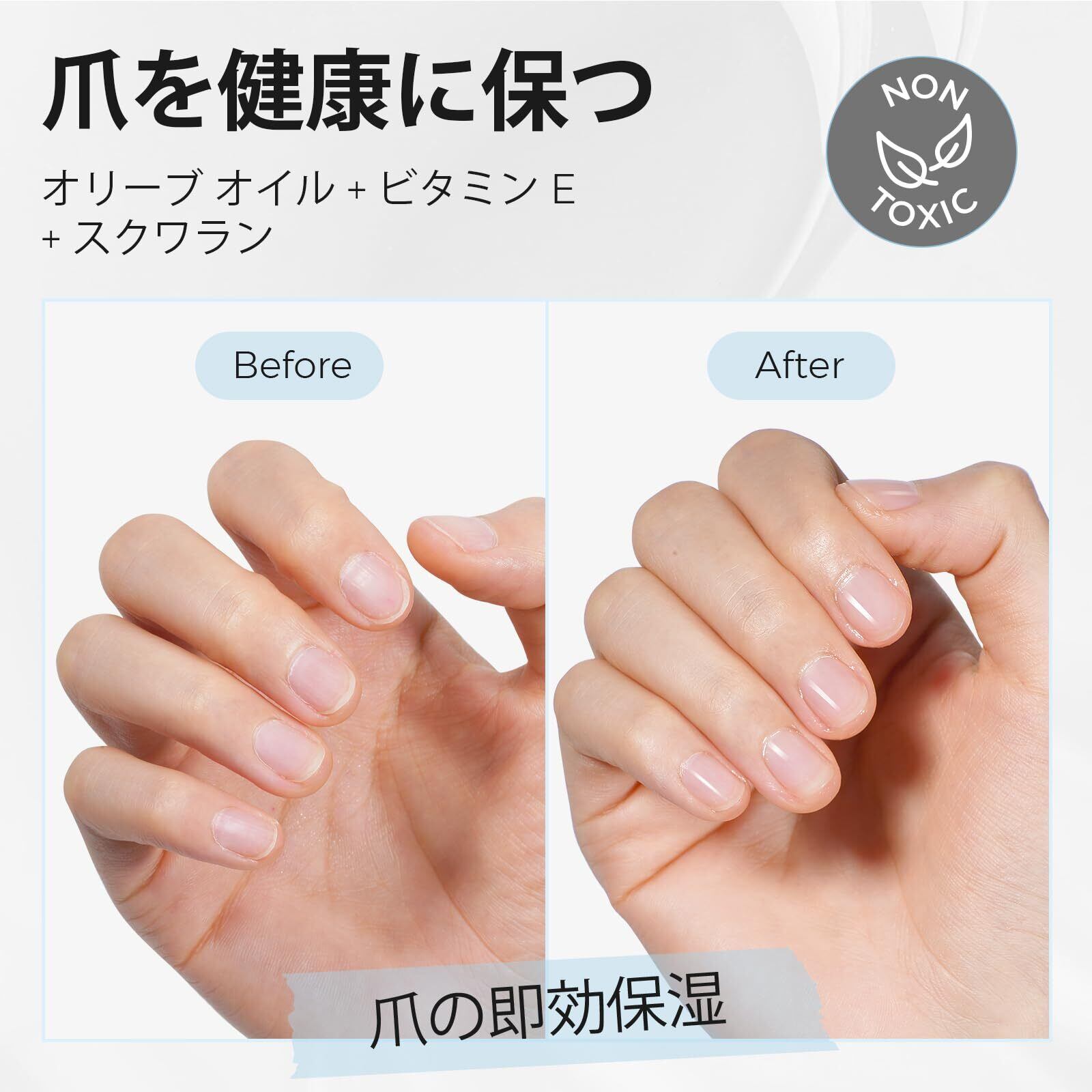 栄養補給と修復: 傷んだ爪、硬くなった爪、乾燥した爪に塗るだけで簡単にケアできます。爪を補修・ケアし、爪の健康をサポートします。爪の端やささくれができやすい部分の乾燥した肌に塗ります。指で優しくこすってマッサージすることで、肌への吸収を促進し、肌に栄養を与え、角質の状態を改善します。