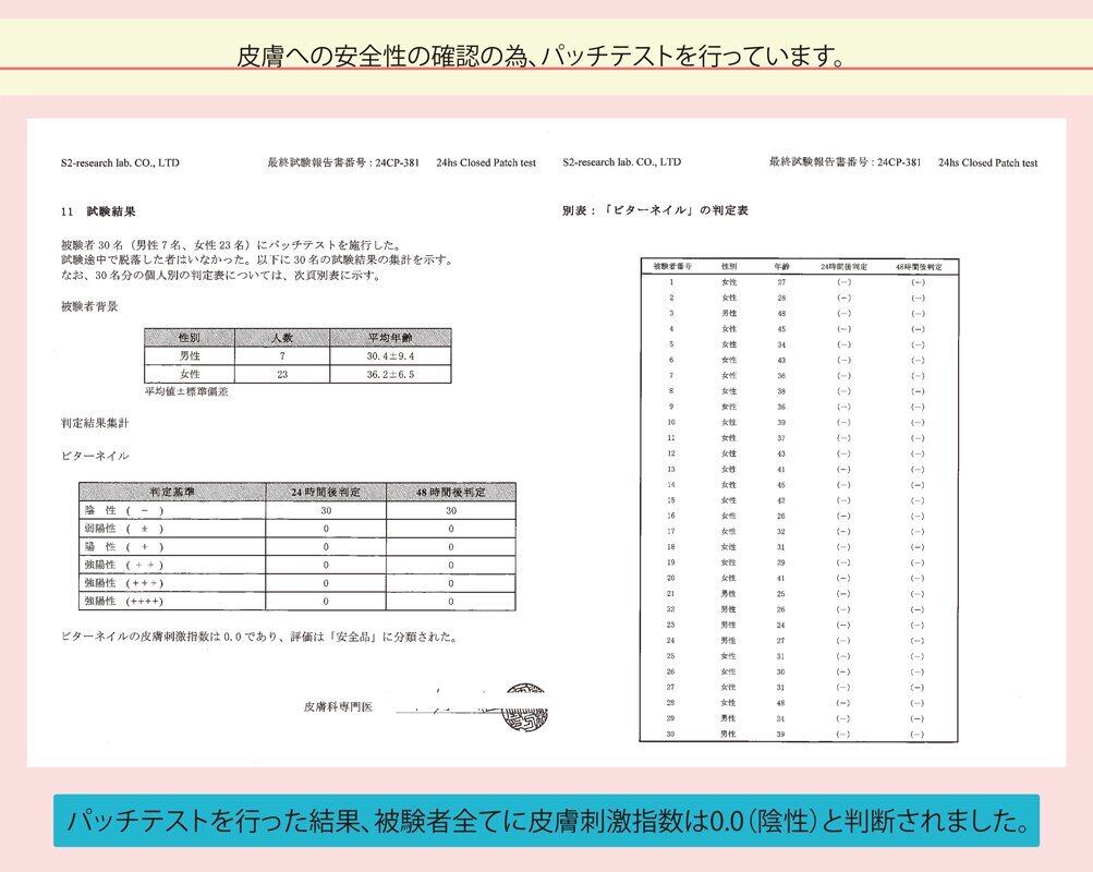 パッチテスト・急性経口毒性試験・食品分析試験 全て実施済み