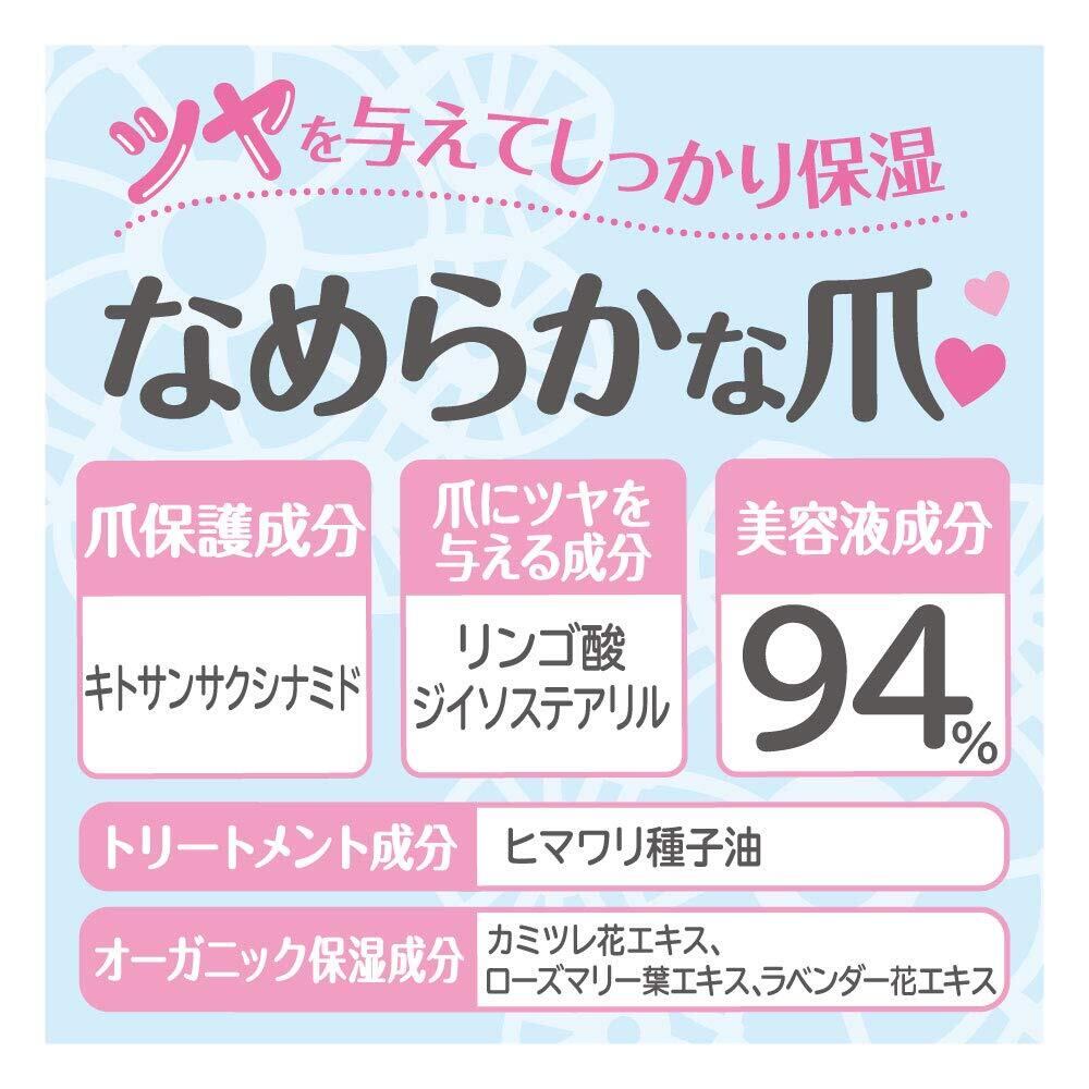 トリートメント成分:ヒマワリ種子油 爪保護成分:キトサンサクシナミド オーガニック保湿成分:カミツレ花エキス 爪にツヤを与える成分:リンゴ酸ジイソステアリル
