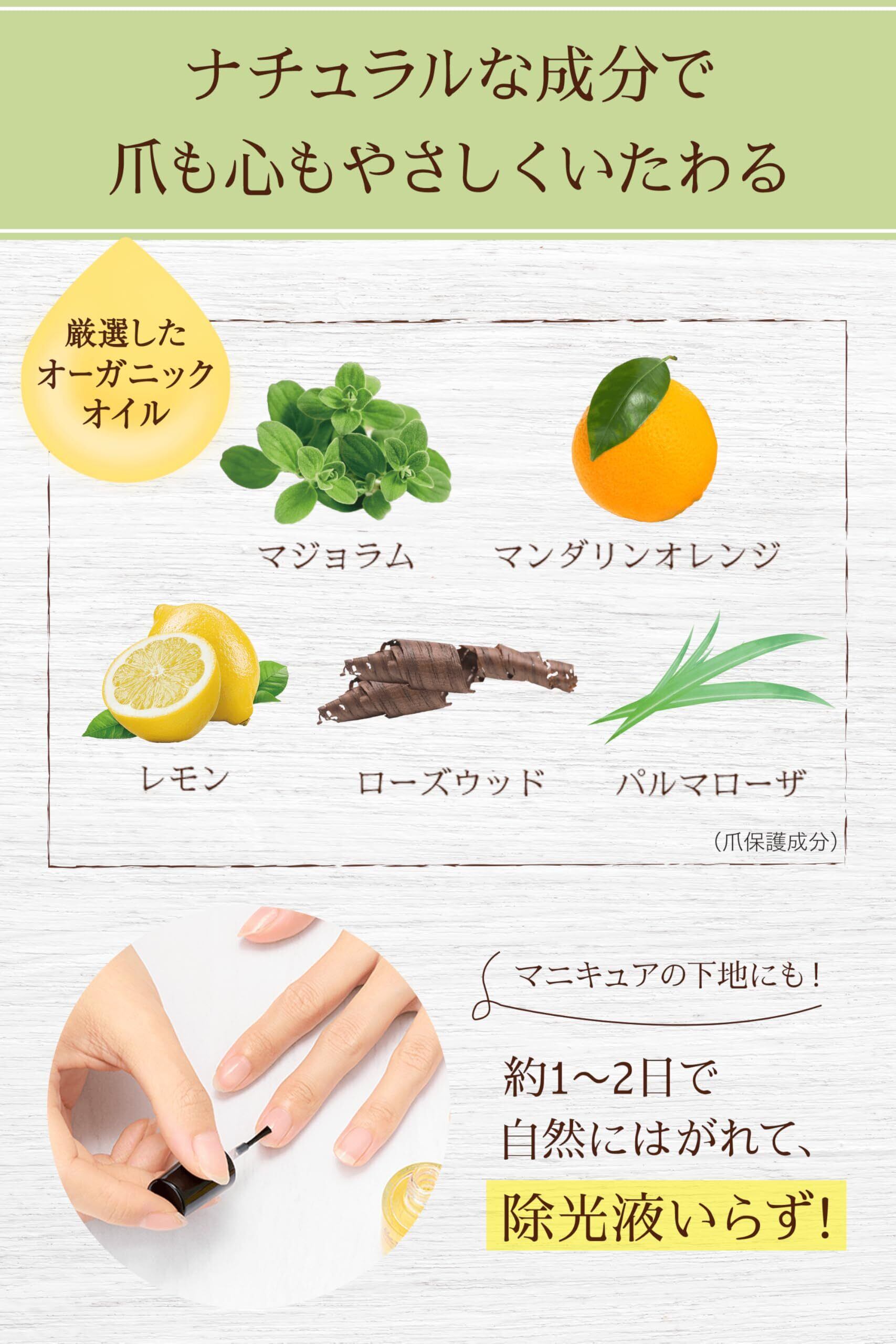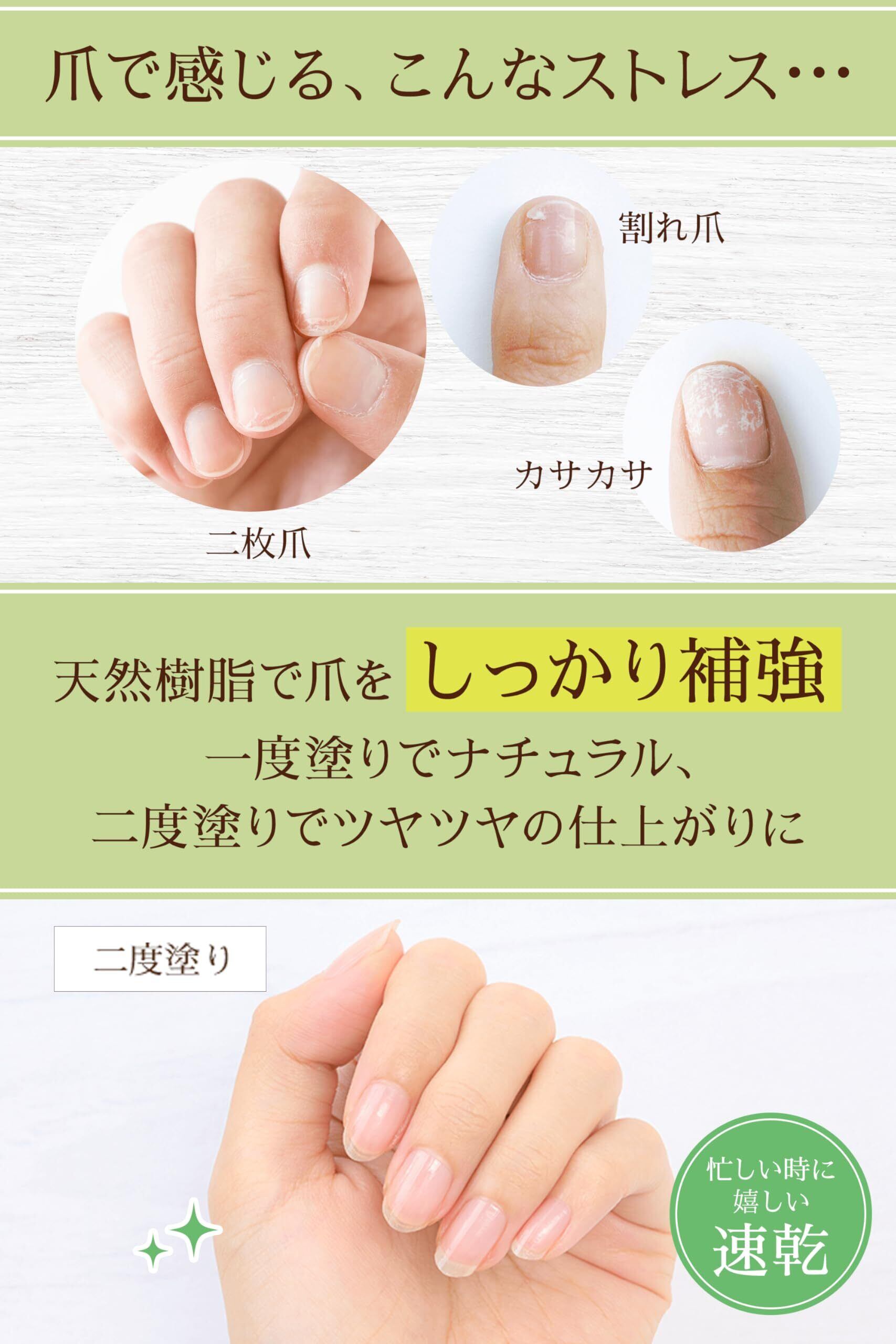 天然樹脂(セラック)でコーティングして二枚爪やダメージを受けやすい薄爪を守ります。爪にやさしく、つややかに保ちます。爽やかでシャープなマジョラムの香り。