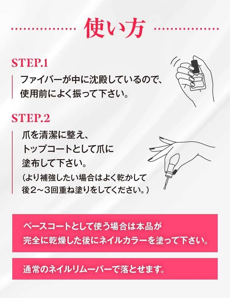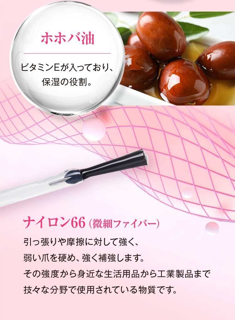 3種類の美容成分とネイル補強物質を配合してます。 パルミチン酸レチノール ケラチン ホホバ油 ナイロン66(微細ファイバー)