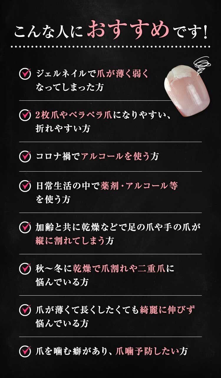 ■こんな方におススメ・・・ ジェルネイルで爪が薄く弱くなってしまった方。 2枚爪やペラペラ爪になりやすい・折れやすい方。 コロナ禍でアルコールを使う方。 日常生活の中で薬剤、アルコール等を使う方。 加齢と共に乾燥などで足の爪や手の爪が縦に割れてしまう。 秋~冬にかけて乾燥の為、爪割れや二重爪に悩んでいる方 爪が薄くて長くしたくても綺麗には伸びず悩んでいる方。 爪を噛む癖があり、爪噛予防したい方。
